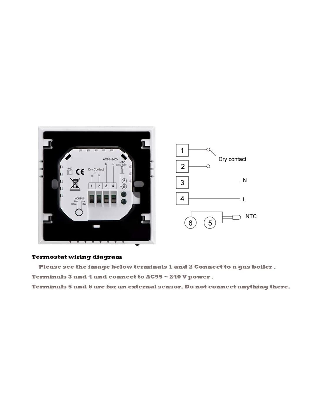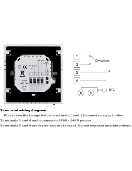 - Installazione: I terminali 1 e 2 si collegano alla caldaia a gas, terminali 3 e 4 si collegano all'alimentazione AC95-240V, i terminali 5 e 6 sono per un sensore esterno.