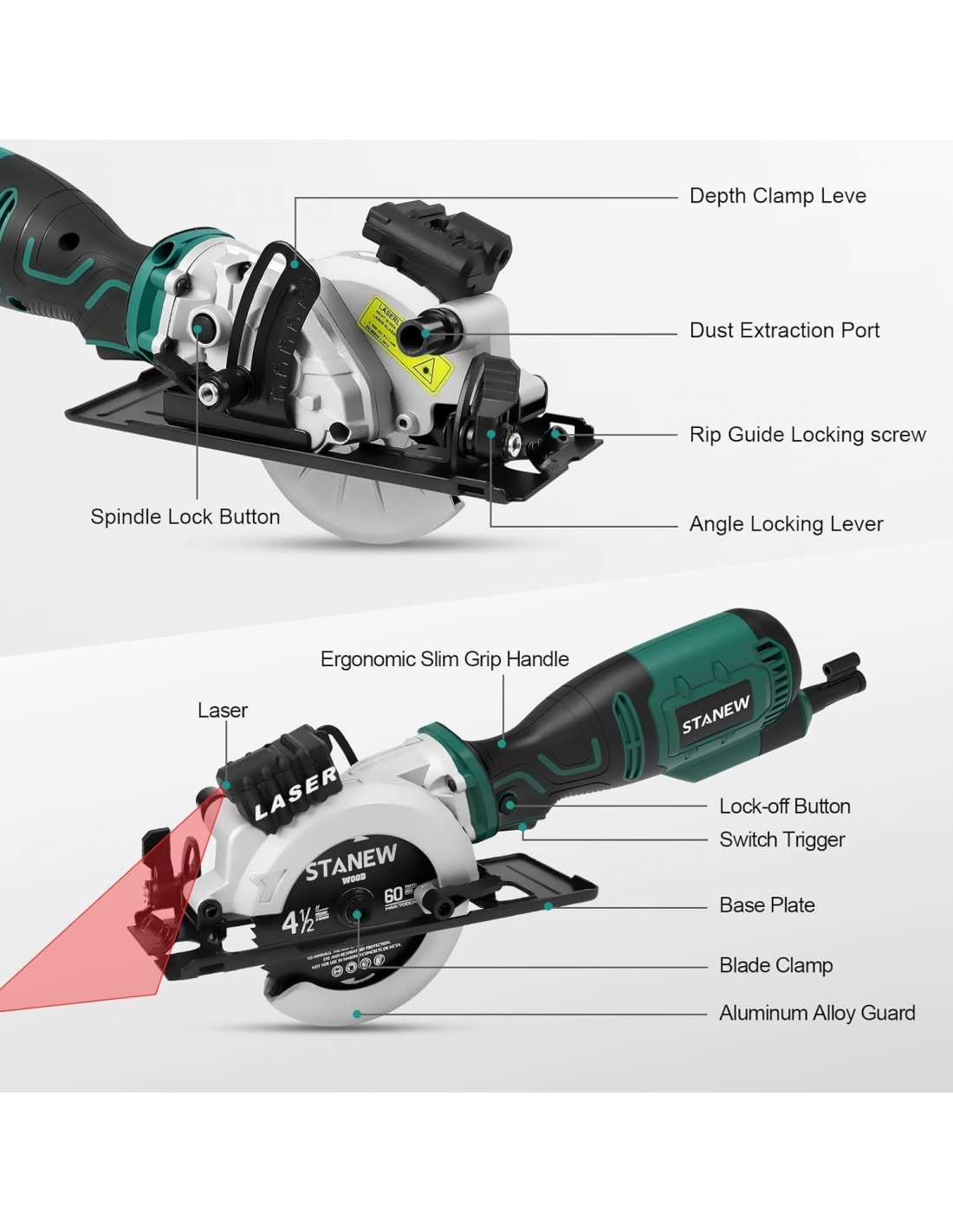 STANEW ST-T301 Mini seghe circolari, sega circolare da 3500 giri/min con 3 lame, guida laser, profondità di taglio massima 42,8 mm (90°), 28 mm (45°), sega circolare compatta per legno, metallo tenero e piastrelle