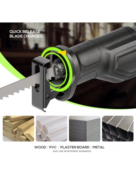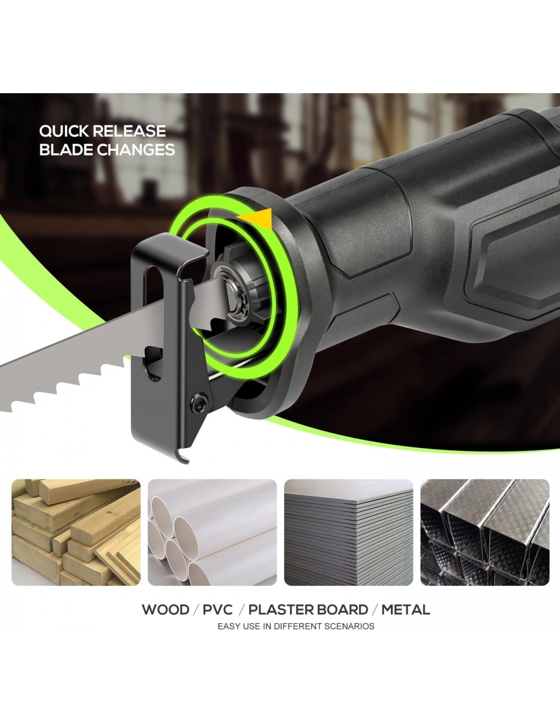 - Facilità d'uso: La sega presenta un grilletto di velocità variabile e un pulsante di blocco che consentono un'operazione continua e un controllo preciso sulla velocità di taglio, garantendo tagli fluidi ed efficienti secondo le esigenze della attività.