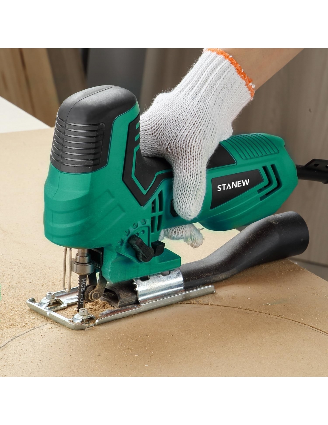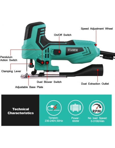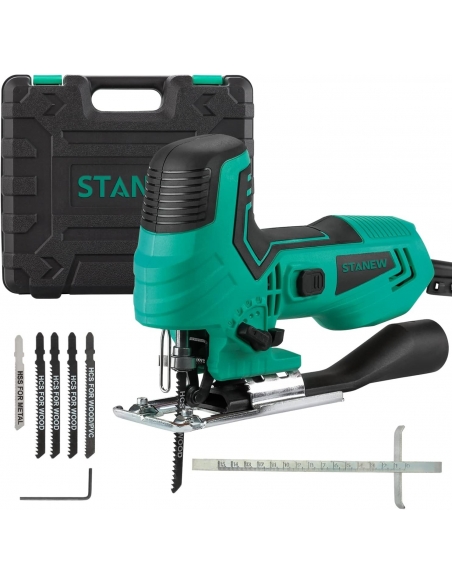 STANEW JS012 Seghetto Alternativo 650W oscillazioni al min. 1000-3000RPM,6 Velocità Regolabili, 5 lame, Angolo di Taglio da 45º, Profondità: Legno/Alluminio/Metallo: 65/6/6 mm
