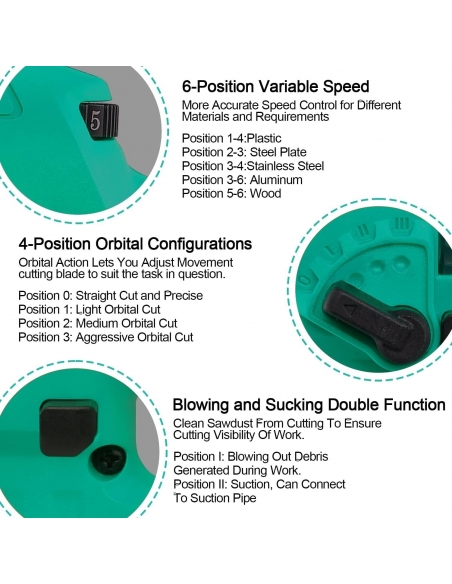 - 4 Orbite Variabili:Coltello di sollevamento file 0-3, adatto a diversi materiali da taglio: maggiore è la velocità, maggiore è la velocità di taglio, adatto per materiali morbidi, minore è la velocità, maggiore è la velocità di taglio. il taglio è lento, più adatto per materiali duri.(Quando si tagliano materiali metallici, si consiglia di impostare su 0, quindi utilizzare una lama per seghetto per tagliare il metallo)