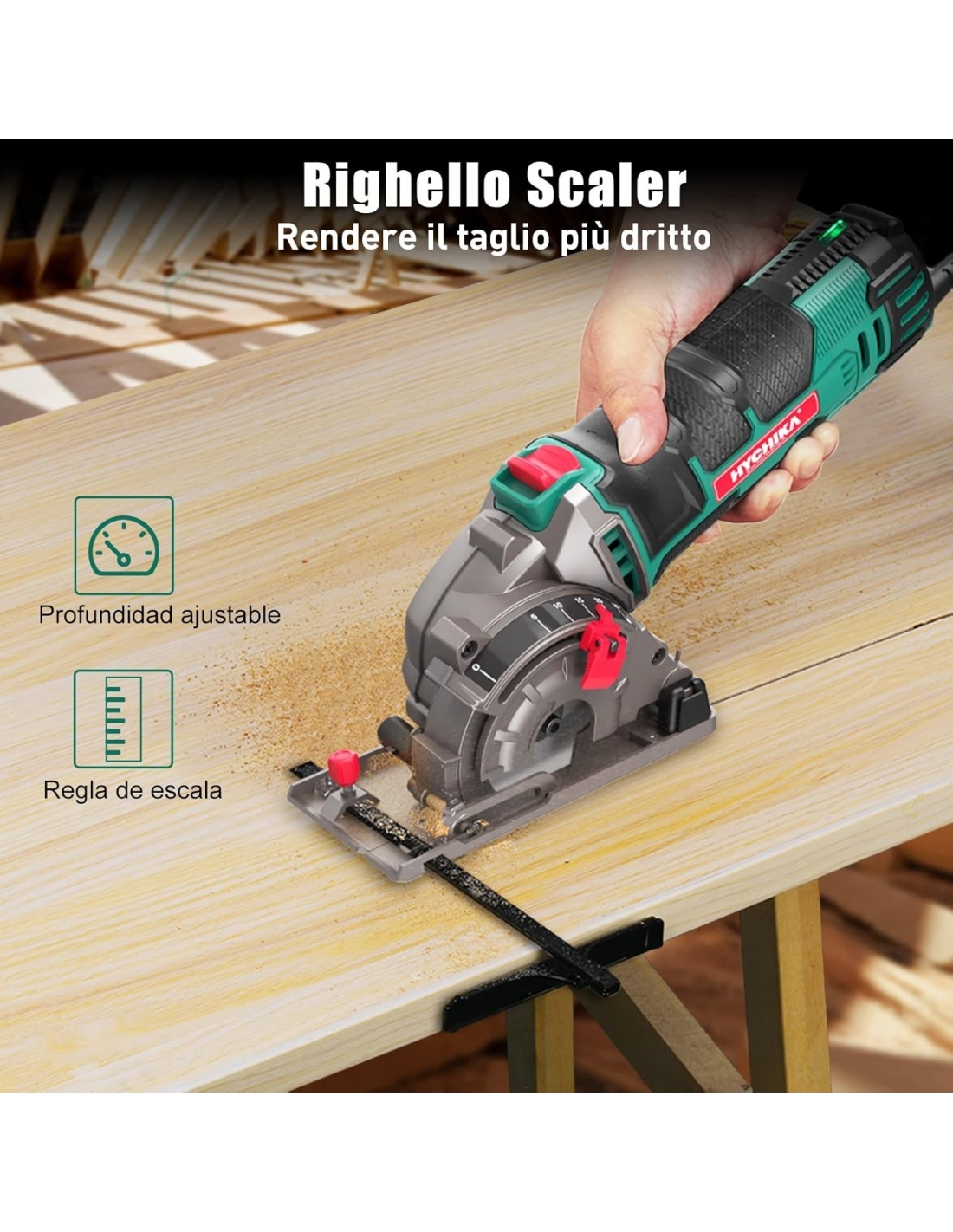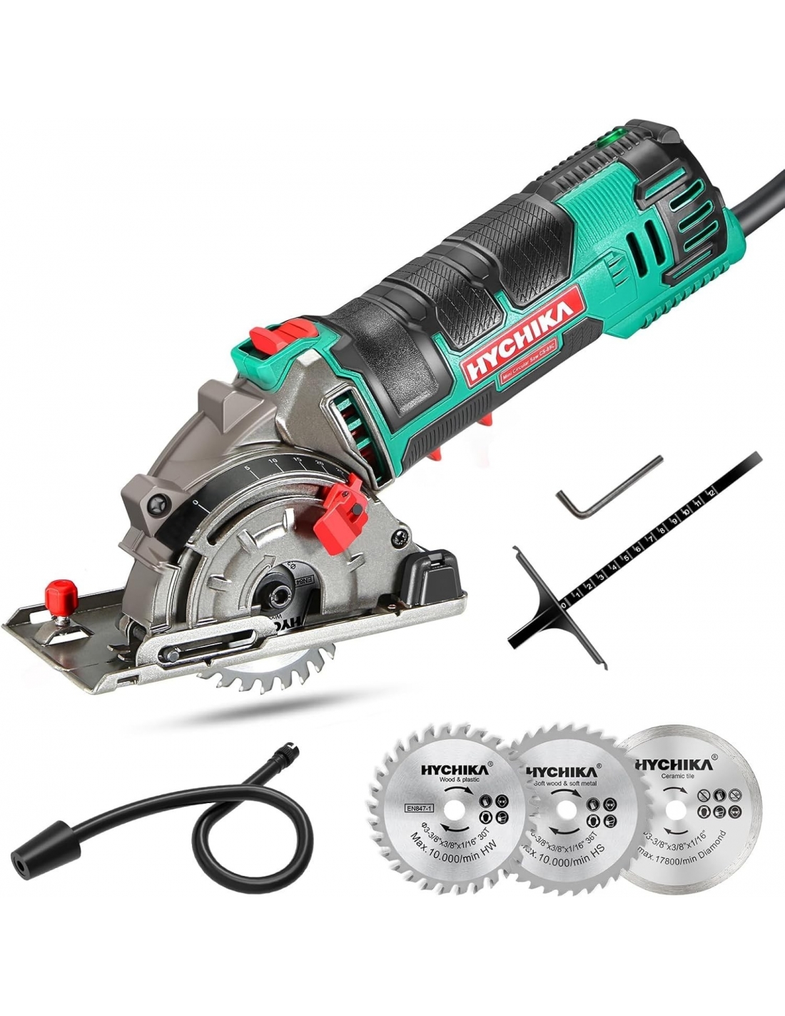 HYCHIKA M1Y-DU05-85 Sega Circolare 500W Mini Seghe Circolare 4500RPM, Profondità di Taglio: 0-25mm,Tubo per Aspirapolvere, 3x Lame adatto per Legno, Plastica, Metallo Morbido