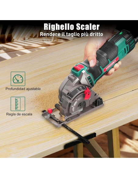 - Potente e Compatta: Mini Sega Circolare 500W di potenza potente ,velocità 4500 giri / min. Ideale per tagliare con facilità legno, metallo, piastrelle, compensato, tubi in PVC, plastica