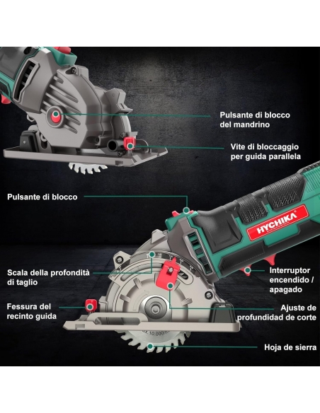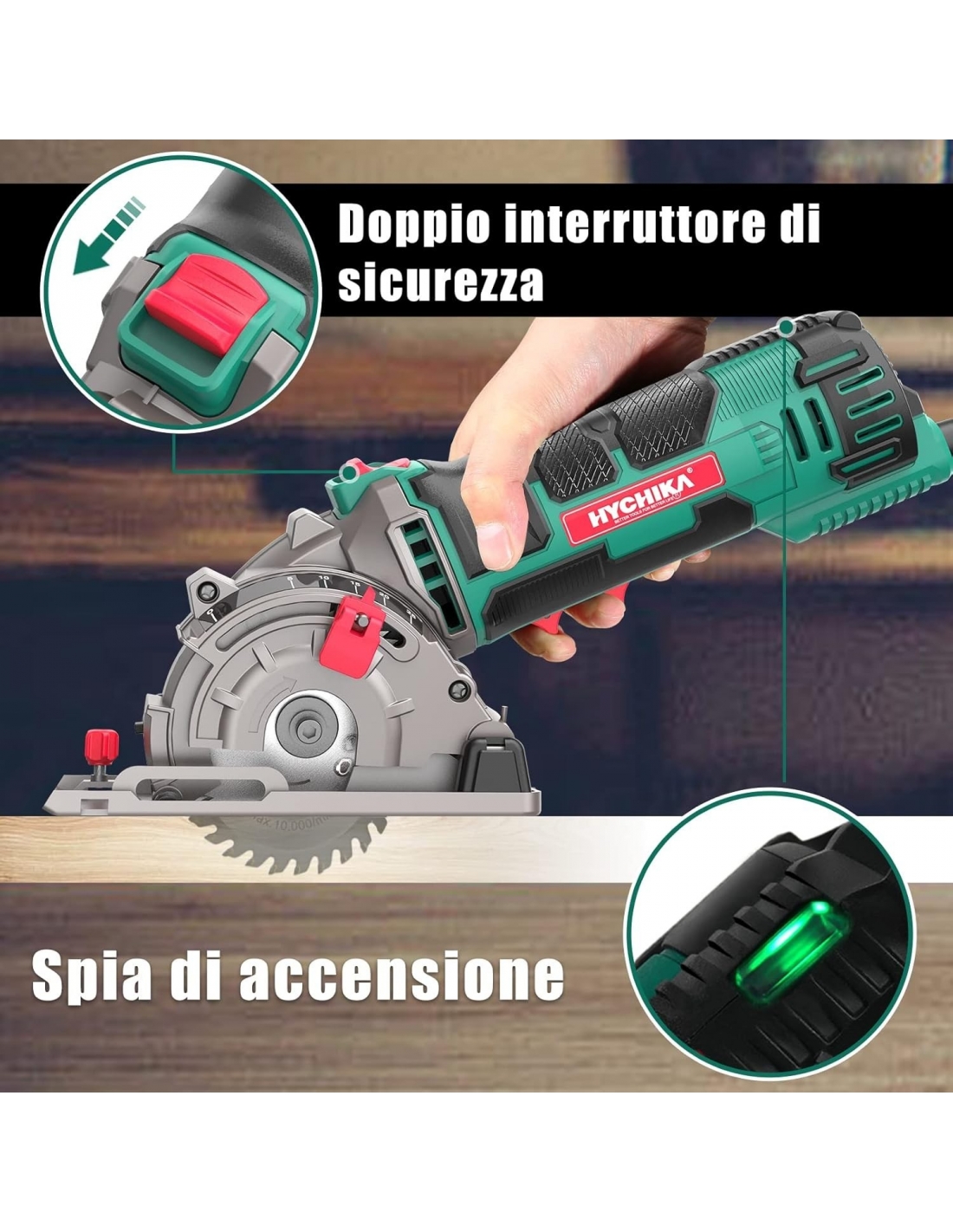 - Robusta dal Design Ergonomico: Manico ergonomico in gomma, antiscivolo. La mini sega circolare Hychika è leggera e di facile uso. Il suo ridotto peso risolve il problema dell'affaticamento nel caso di lavori a lunghi. Il motore della minisega Hychika è in rame ,il calore generato dalla macchina è così ridotto e quindi prolunga la vita della macchina