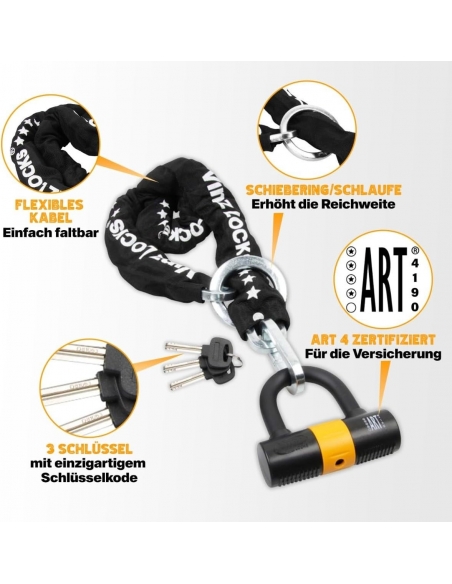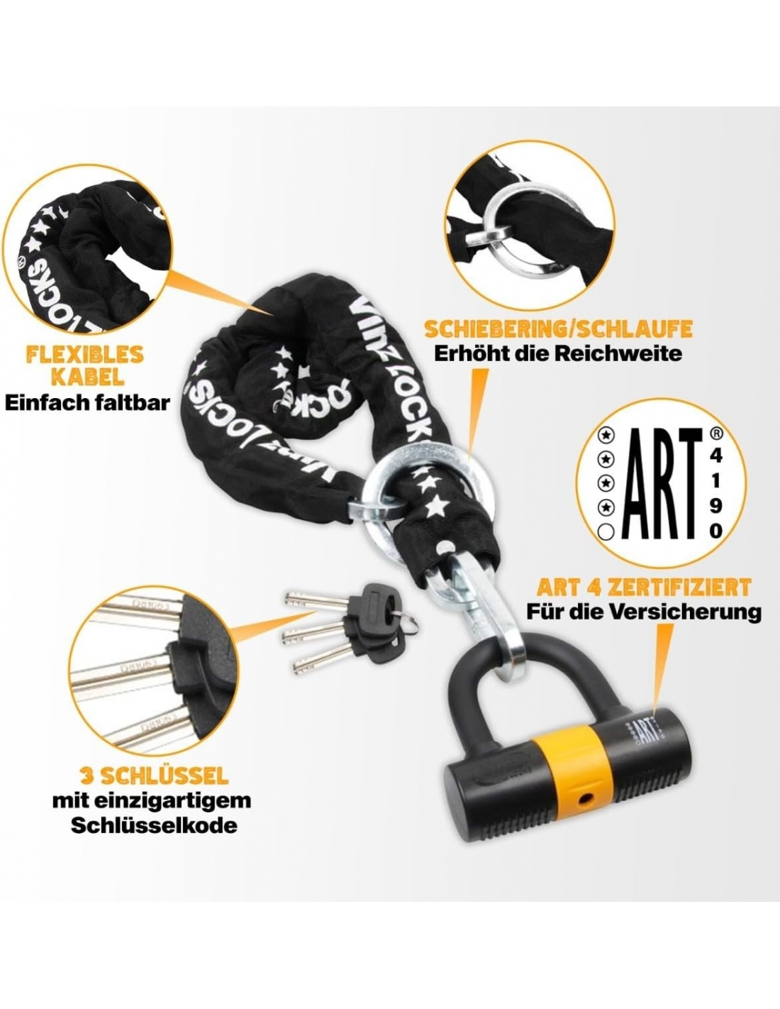 - MARCHIO DI QUALITÀ - Il lucchetto ha una certificazione ART 4, quindi è raccomandato dalla maggior parte delle compagnie assicurative per biciclette, scooter e motociclette. La fondazione ART ha testato e valutato questo lucchetto in modo indipendente. Questo rende il lucchetto per moto una scelta ideale per la sicurezza. Se intendi assicurare il tuo veicolo, questo lucchetto è assolutamente consigliato. Anche se non vuoi assicurare il veicolo, resta comunque una protezione affidabile.