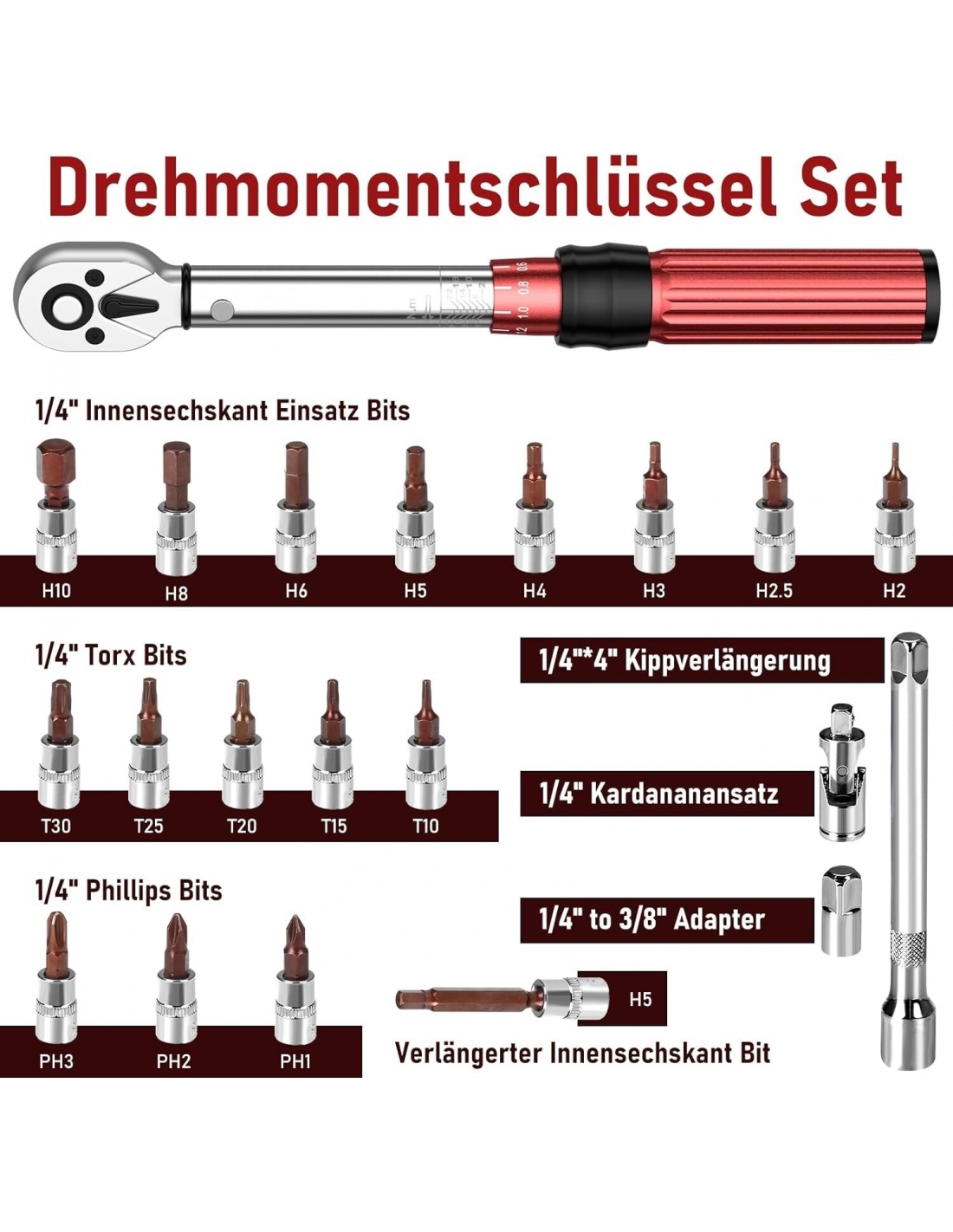 - Ampia applicazione: il set di chiavi dinamometriche include 8 punte a esagono incassato: H2, H2.5, H3, H4, H5, H6, H8, H10; 5 punte Torx: T10, T15, T20, T25, T30; 3 punte Phillips: PH1, PH2, PH3 e bussola esagonale estesa. Punta: H5; estensione inclinabile da 1/4 di pollice x 4 di pollice; attacco cardanico da 1/4 di pollice; adattatore da 1/4 di pollice a 3/8 di pollice. Ampia applicazione per installazione di apparecchiature, ingegneria elettrica, manutenzione di biciclette/motociclette e assemblaggio di prodotti.