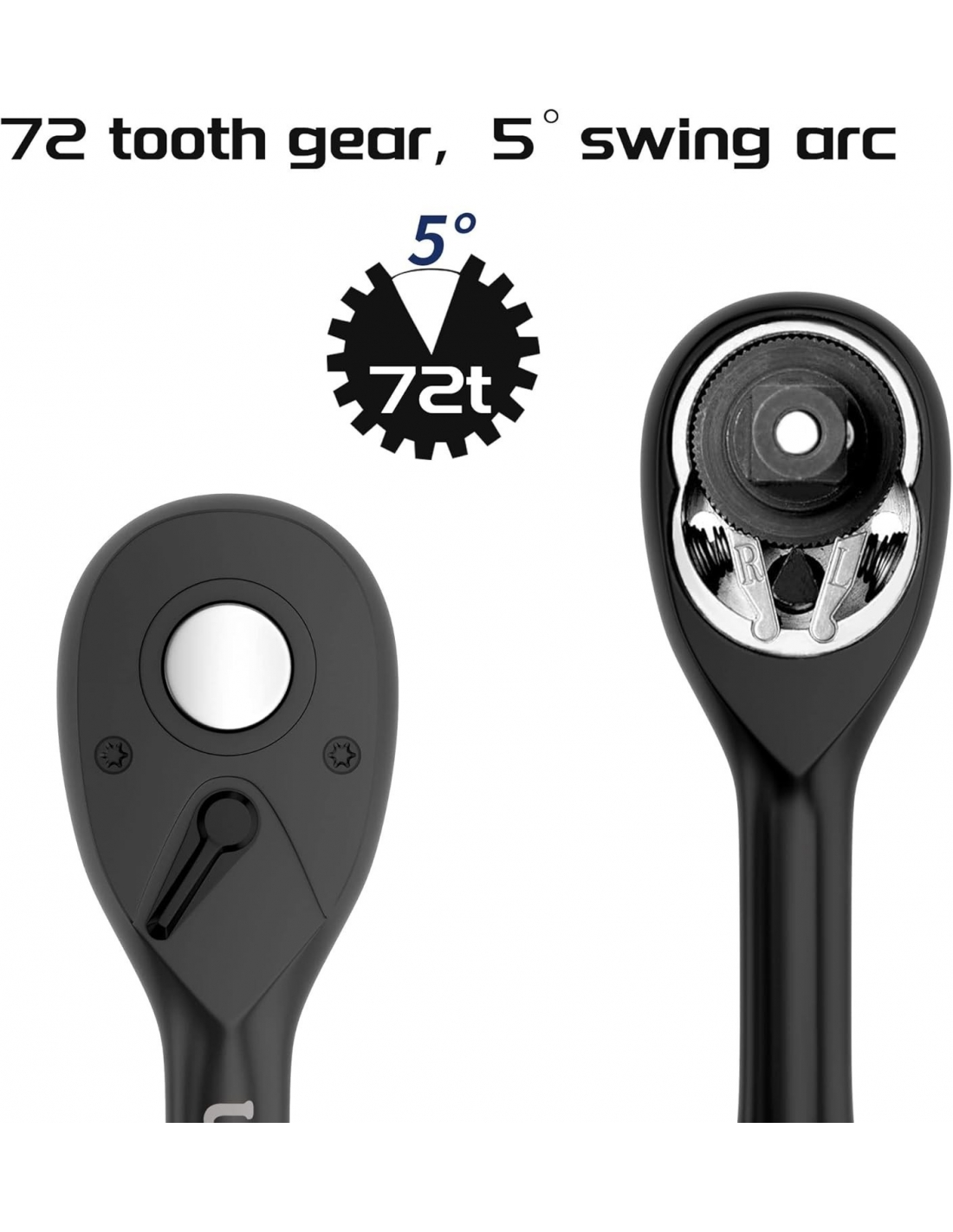 - DESIGN PROFESSIONALE La testa reversibile a 72 denti e il gomito a cricchetto a 5° consentono di ruotare gli elementi di fissaggio in spazi ristretti. Il perno a sgancio rapido si blocca saldamente nelle bussole, evitando che cadano accidentalmente.