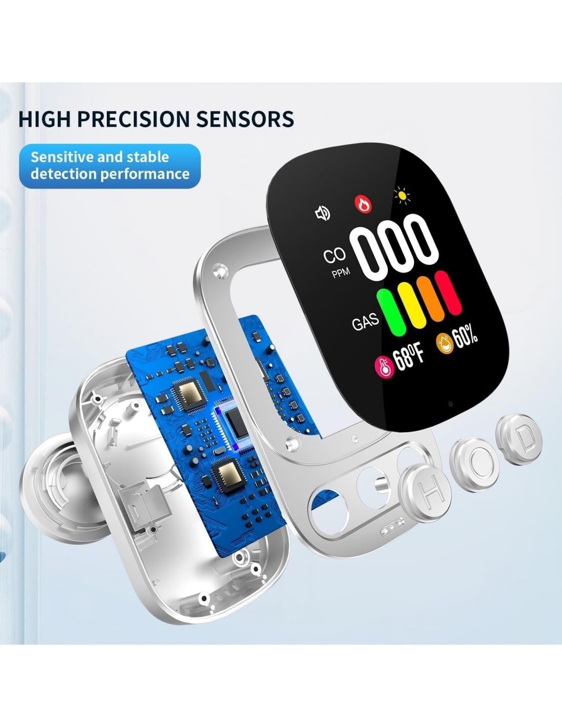 - Prestazioni elevate e lunga durata: Questo dispositivo utilizza il principio della reazione elettrochimica e della variazione di resistenza elettrica dei semiconduttori per rilevare il monossido di carbonio e i gas combustibili in modo rapido e preciso. I sensori di questo dispositivo hanno prestazioni elevate e una lunga durata di vita di circa 5 anni.
