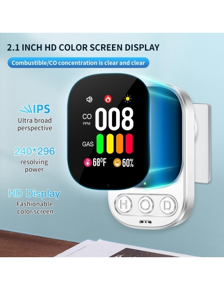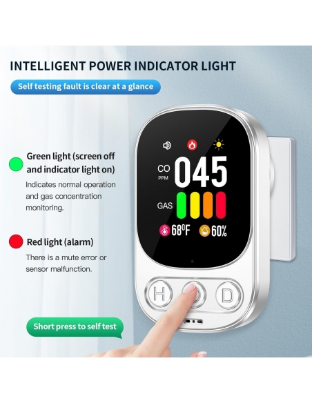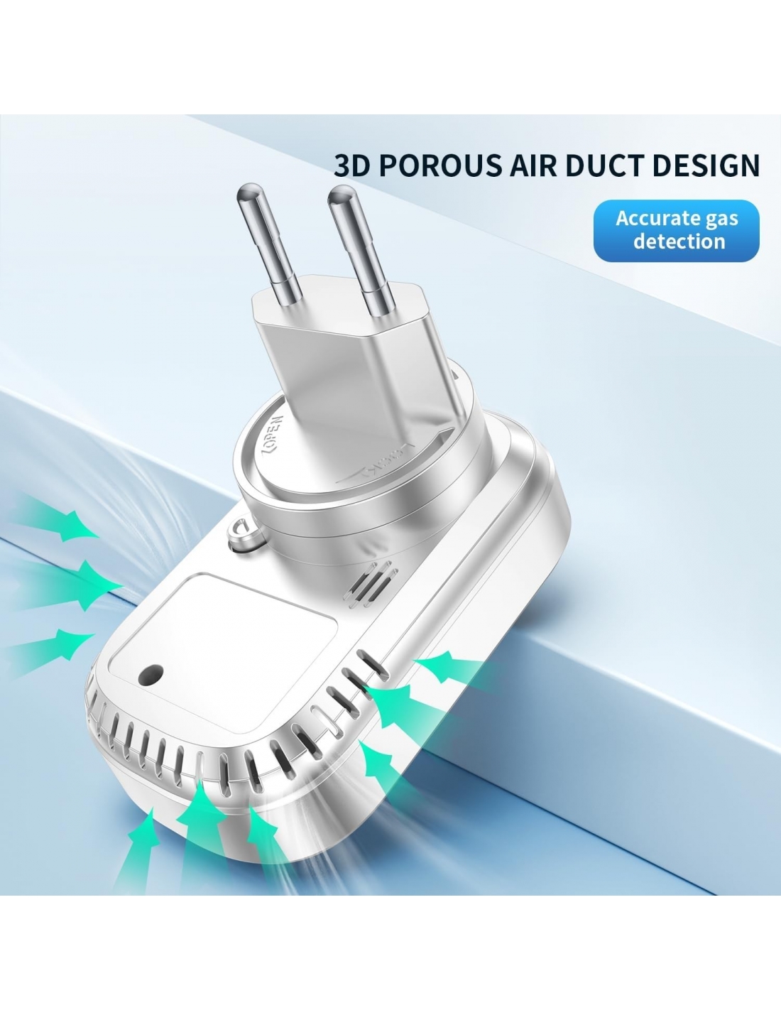 - Rivelatore combinato di gas e monossido di carbonio: Collegato alla presa di corrente di casa, il dispositivo entra immediatamente in funzione e monitora continuamente il livello di monossido di carbonio (CO) e di gas combustibili come gas naturale, metano, etano, propano, butano, ecc.