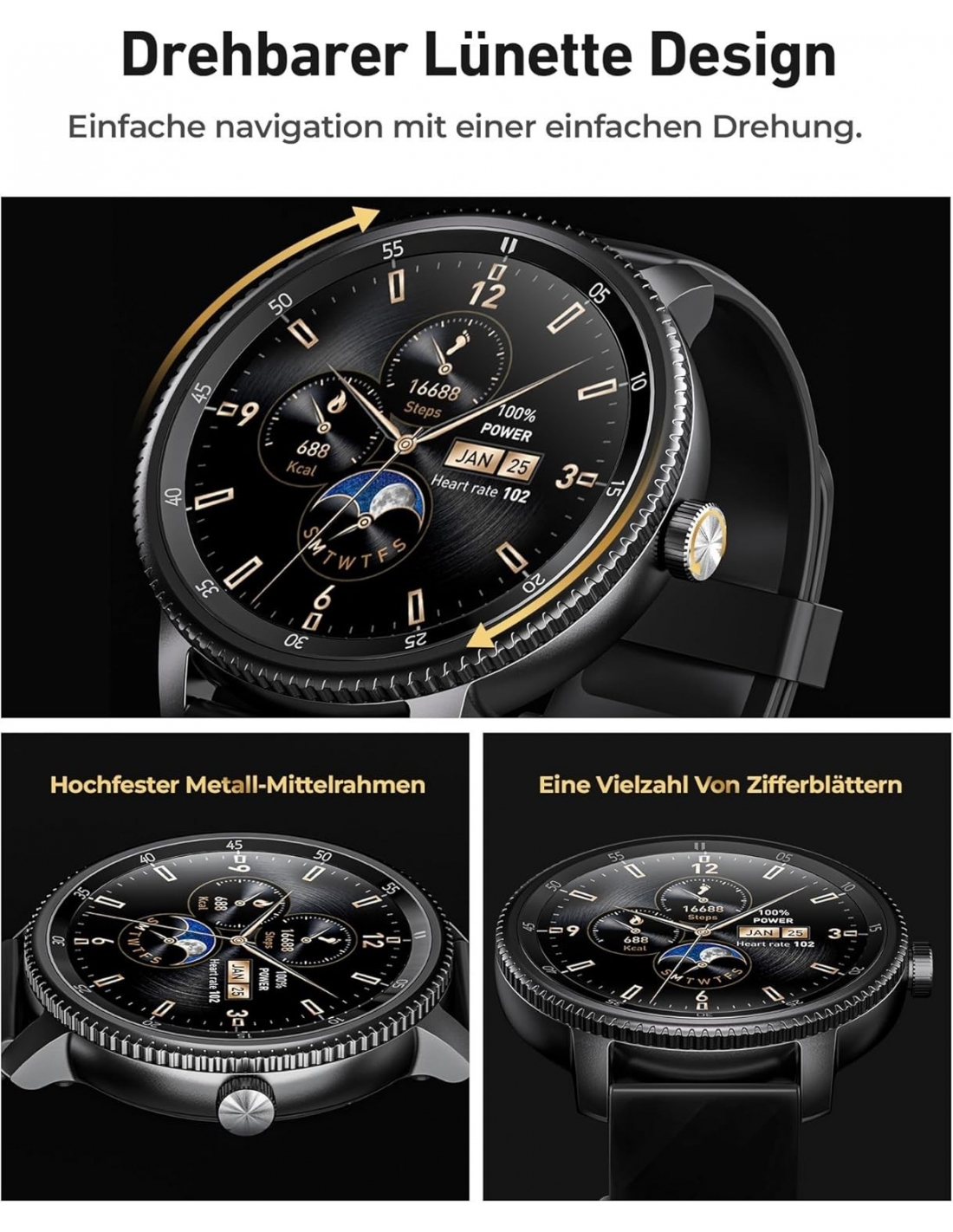 - Design Funzionale Della Corona - Lo smartwatch DV09 è caratterizzato da un design unico della corona in lega di zinco che consente di utilizzare l'orologio in modo facile e fluido con una semplice rotazione. Toccando due volte la corona si accede rapidamente all'ampio menu delle funzioni e ruotandola si può navigare facilmente nell'elenco e trovare la funzione desiderata. Con oltre 200 stili di quadrante, tra cui design dinamici e interattivi e opzioni di visualizzazione statiche sempre attive, è possibile personalizzare l'orologio con una semplice rotazione della corona sulla pagina iniziale!