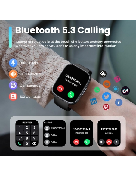 Chiamate Bluetooth e Notifiche Intelligenti: Questo smartwatch da donna e da uomo è dotato di un processore single-chip di ultima generazione e di un microfono altamente reattivo, per cui non è necessario inserire una scheda SIM per effettuare o ricevere chiamate. Inoltre, l'orologio smartwatch sincronizza in tempo reale i messaggi di testo e quelli provenienti dalle app (ad esempio Whatsapp, Facebook, Twitter, Instagram, Skype, ecc.), consentendo di vivere una vita colorata e intelligente.