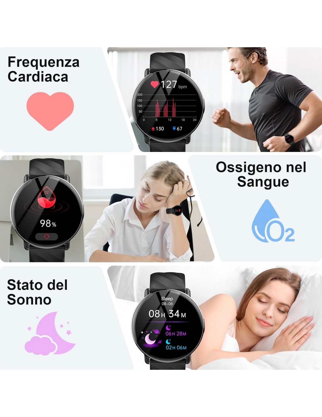 Chiamata Bluetooth and Promemoria Intelligente: Questo smartwatch supporta la funzione di chiamata Bluetooth per ricevere/comporre chiamate, visualizzare la cronologia delle chiamate e memorizzare i contatti. L'smart watch vi avviserà con una vibrazione quando riceverete un messaggio di testo o una notifica dai social media (come Facebook, WhatsApp, Instagram, Twitter, ecc.). L'invio di messaggi in tempo reale garantisce che non si perda nessuna informazione importante, facilitando la comunicazione.