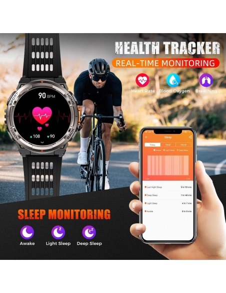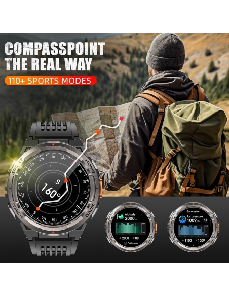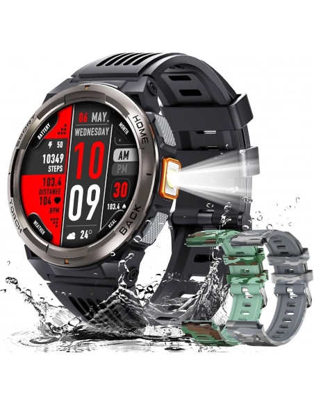 L'orologio intelligente militare EIGIIS per gli uomini è certificato come impermeabile 3ATM, dopo aver superato il test per resistere a profondità fino a 30 metri sott'acqua. Ideale per nuotare, fare snorkeling, immersioni o fare surf (Nota: non usarlo in mare o acqua calda, come bagno o sauna). Inoltre, l'orologio intelligente impermeabile EIGIIS dispone di una comoda torcia a LED montata lateralmente, migliorando la sua praticità per le avventure e illuminando il tuo percorso attraverso la natura selvaggia! L'orologio intelligente EIGIIS KE5 ha anche un allarme SOS extra, perfetto per la sopravvivenza all'aperto.