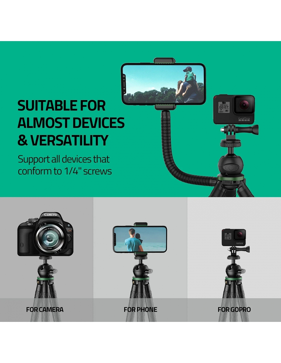 ✔ 【Ben costruito e durevole】: le gambe flessibili del treppiede TECELKS sono realizzate con strisce di alluminio rinforzate e gomma di alta qualità e abbastanza resistenti da contenere 6,6 libbre. Piegarsi migliaia di volte senza compromettere l'integrità del prodotto. Che siano montati su una bicicletta, su una ringhiera, su un ramo o su una recinzione, i nostri treppiedi sono lo strumento ideale per registrare grandi momenti sempre e ovunque.
