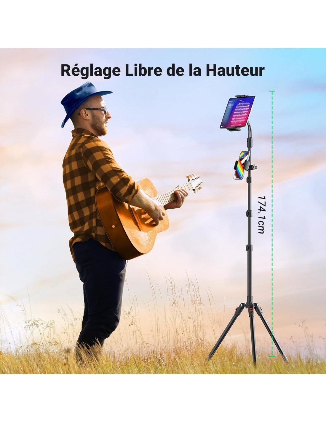 - [Altezza e angolazioni regolabili] Questo supporto per tablet offre 4 livelli di regolazione dell'altezza, da 56 cm a 174 cm. Puoi regolarlo alla lunghezza che preferisci. La testa girevole integrata supporta una rotazione del collo di 180° e una rotazione di 360°, consentendo di sollevare, abbassare e scattare foto verticali.
