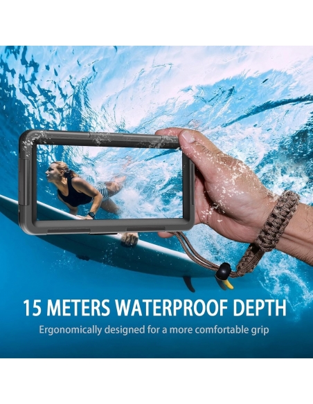 - ROBUSTO, SOLIDALE E IMPERMEABILE: la custodia subacquea, di piccole dimensioni e impermeabile fino a 15 m, 2 ore, è realizzata in una spessa pellicola trasparente in PET e plastica composita, uno schermo morbido ma resistente.
