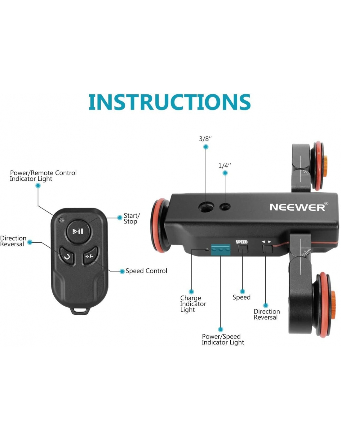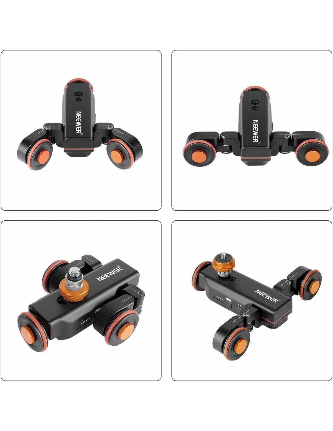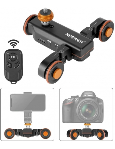 - 【Carrello Telecomandato】 Questo dolly per fotocamera motorizzato di Neewer è uno strumento perfetto per registrare i video time-lapse, dal basso e panoramici. Usare il telecomando wireless per impostare le diverse velocità (1,4cm/s, 2,4cm/s, 3cm/s), cambiare la direzione e avviare o metter in pausa il carrello entro 6 metri. Nota: durante la registrazione dell'audio si sentirà rumore durante il funzionamento di un'auto a dondolo motorizzata.