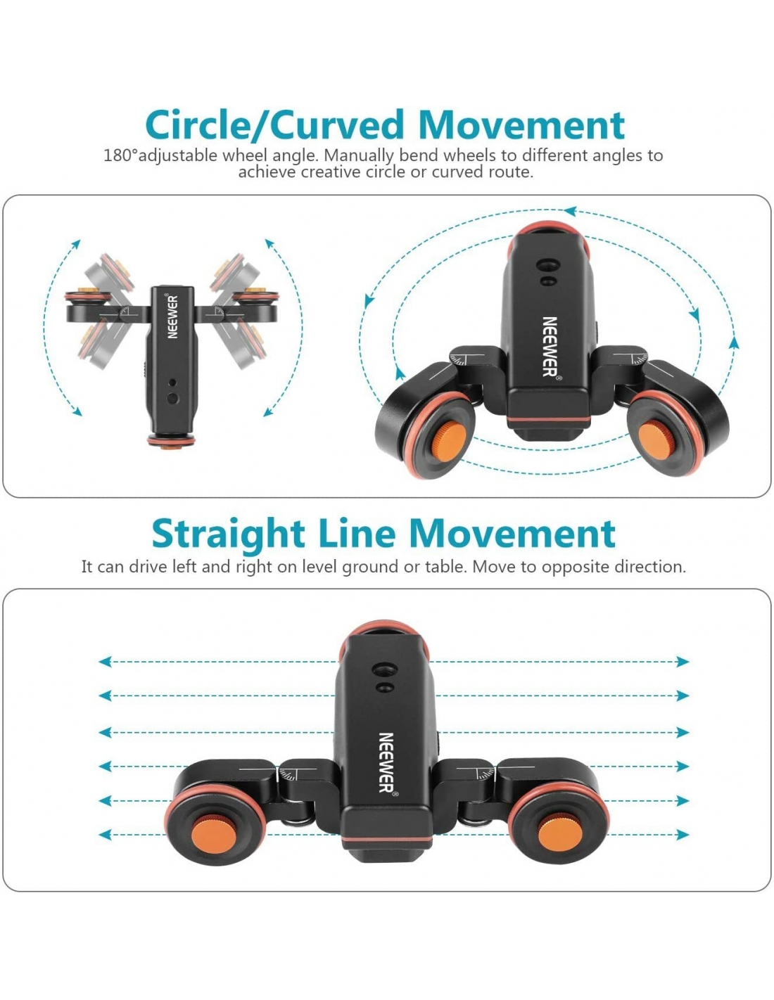 - 【Ruote Regolabili】 Le ruote girevoli a 90° permettono al dolly di muoversi lungo i percorsi circolari o lineari. La vite 1/4”-3/8” reversibile si adatta alla maggior parte di teste per video, teste a sfera e supporti clip per smartphone. Il carrello funziona pure con slider per ottenere gli effetti zoom.