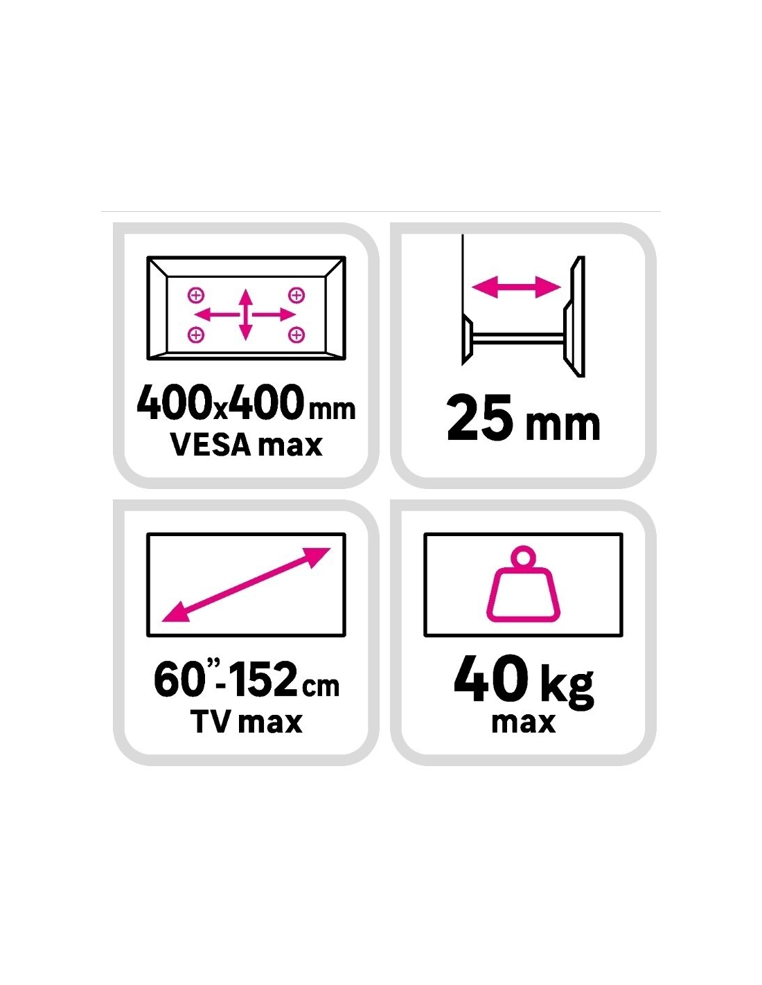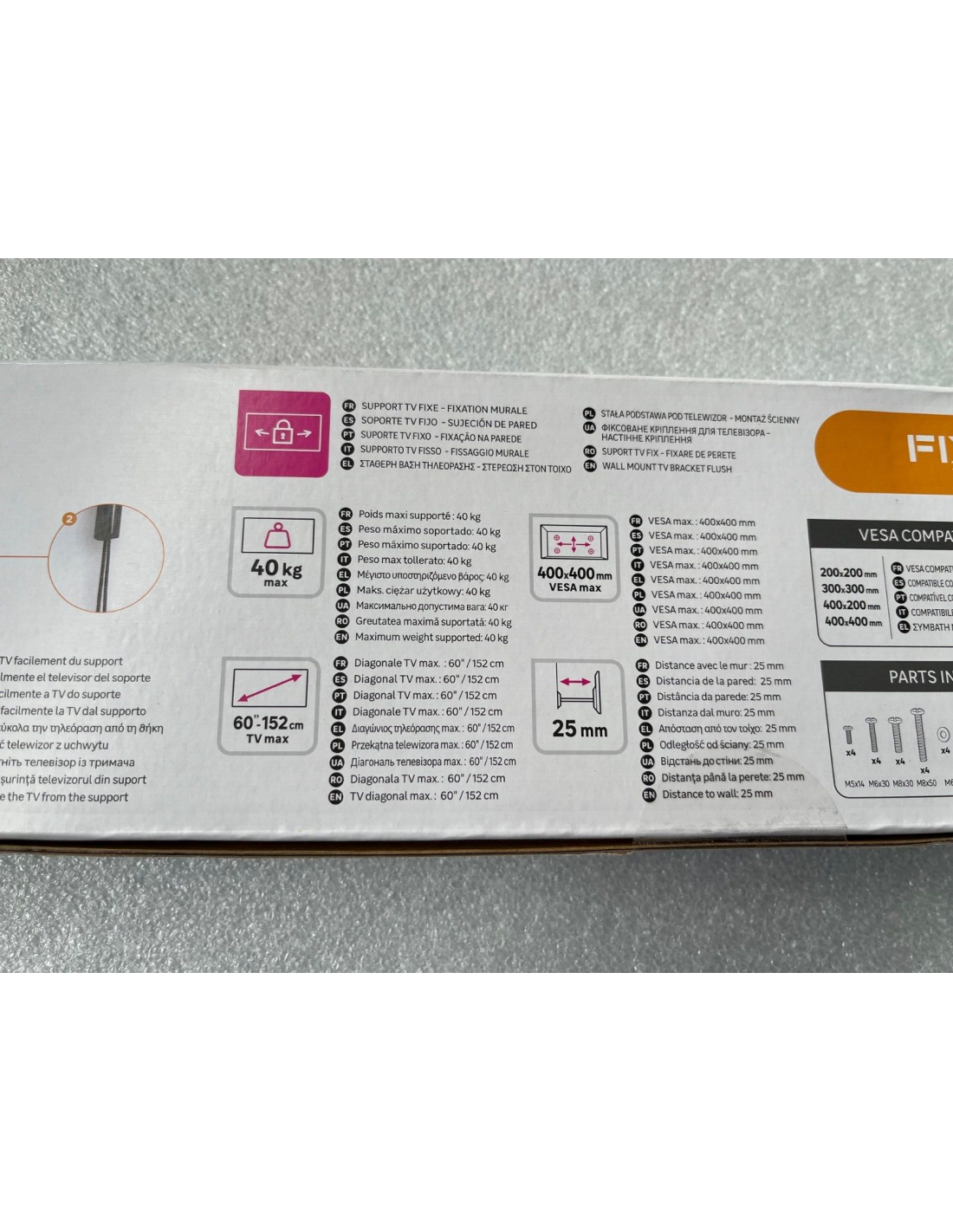 Fix System è un attacco fisso per Tv, indicato per schermi schermi piatti da 30" a 60". È compatibile con schermi fino a 60" o 152 cm di diagonale. Grazie al suo sistema di bloccaggio, il "Sistema FIX" garantisce stabilità e protegge la tua TV portata fino a 40kg. Risulta invisibile dopo la sua installazione e conferisce uno stile moderno alla stanza risparmiando spazio. Le due corde consentono di rimuovere la Tv rapidamente e facilmente dal supporto. La livella a bolla per fissarlo al muro è inclusa nella confezione