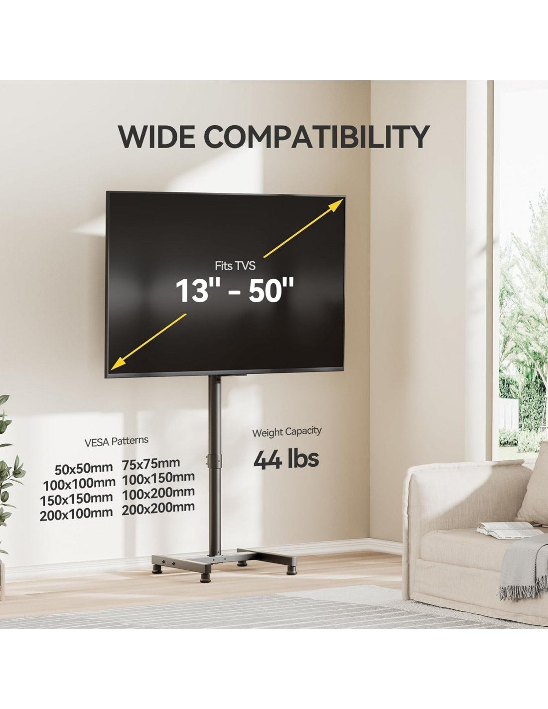 - Ampia compatibilità TV fino a 50 pollici: il supporto da pavimento per TV AM alphamount si adatta alla maggior parte dei televisori e monitor piatti/curvi da 13-50 pollici, compatibile con Samsung, Sony, LG, Hisense, Vizio, ecc. Questo supporto portatile per TV può contenere fino a 20 kg con modelli VESA da 75 x 75 a 200 x 200 mm.