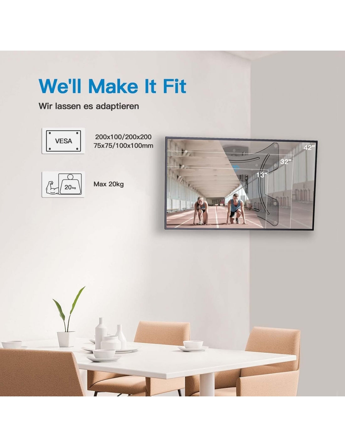 - Compatibilità Universale - Questo supporto tv parete è adatto per la maggior parte dei televisori piatti e curvi da 13-42 pollici con un peso fino a 20 kg. Compatibile con VESA (modello con fori di montaggio) 75x75, 100X100, 200x100 e 200x200mm. Si prega di controllare le dimensioni, il peso e VESA della vostra TV prima dell'acquisto supporto tv.