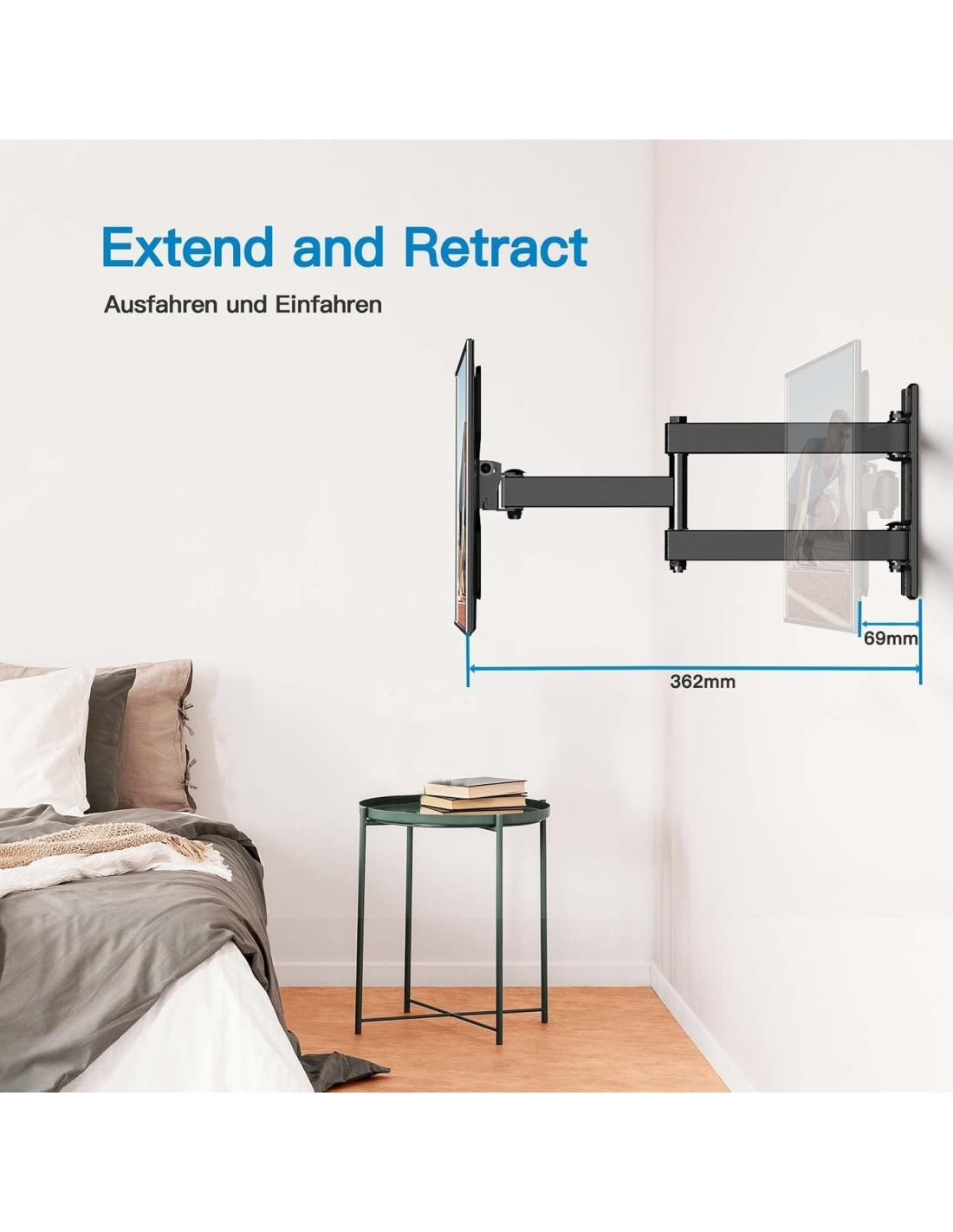 - Estende e Si Ritrae per Risparmiare Spazio - Il nostro supporto TV si ritrae fino a 69 mm dal muro nella posizione di partenza e può anche essere esteso fino a un massimo di 362 mm dal muro. Ciò consente di risparmiare spazio prezioso e dà alla tua casa un aspetto bello e ordinate.