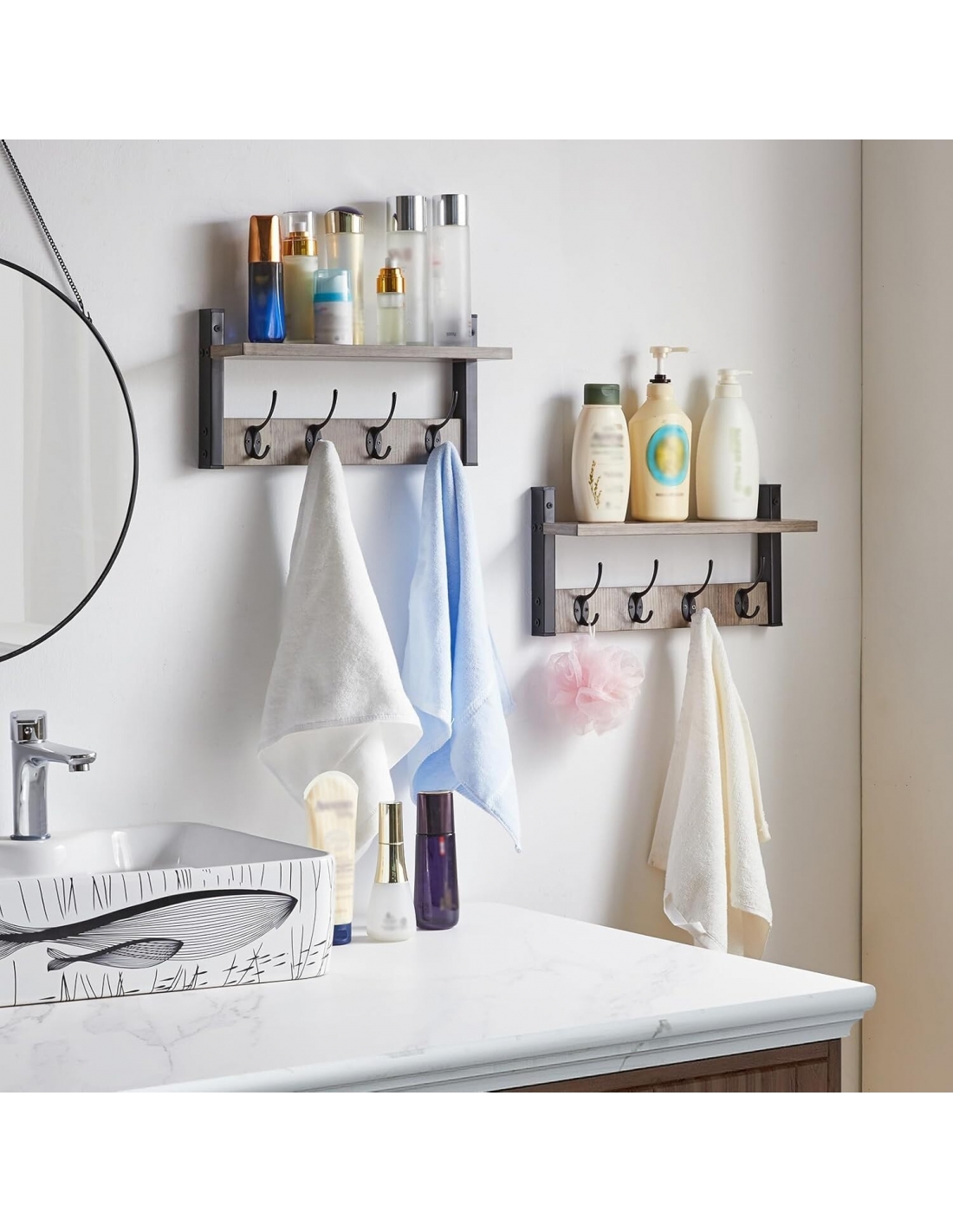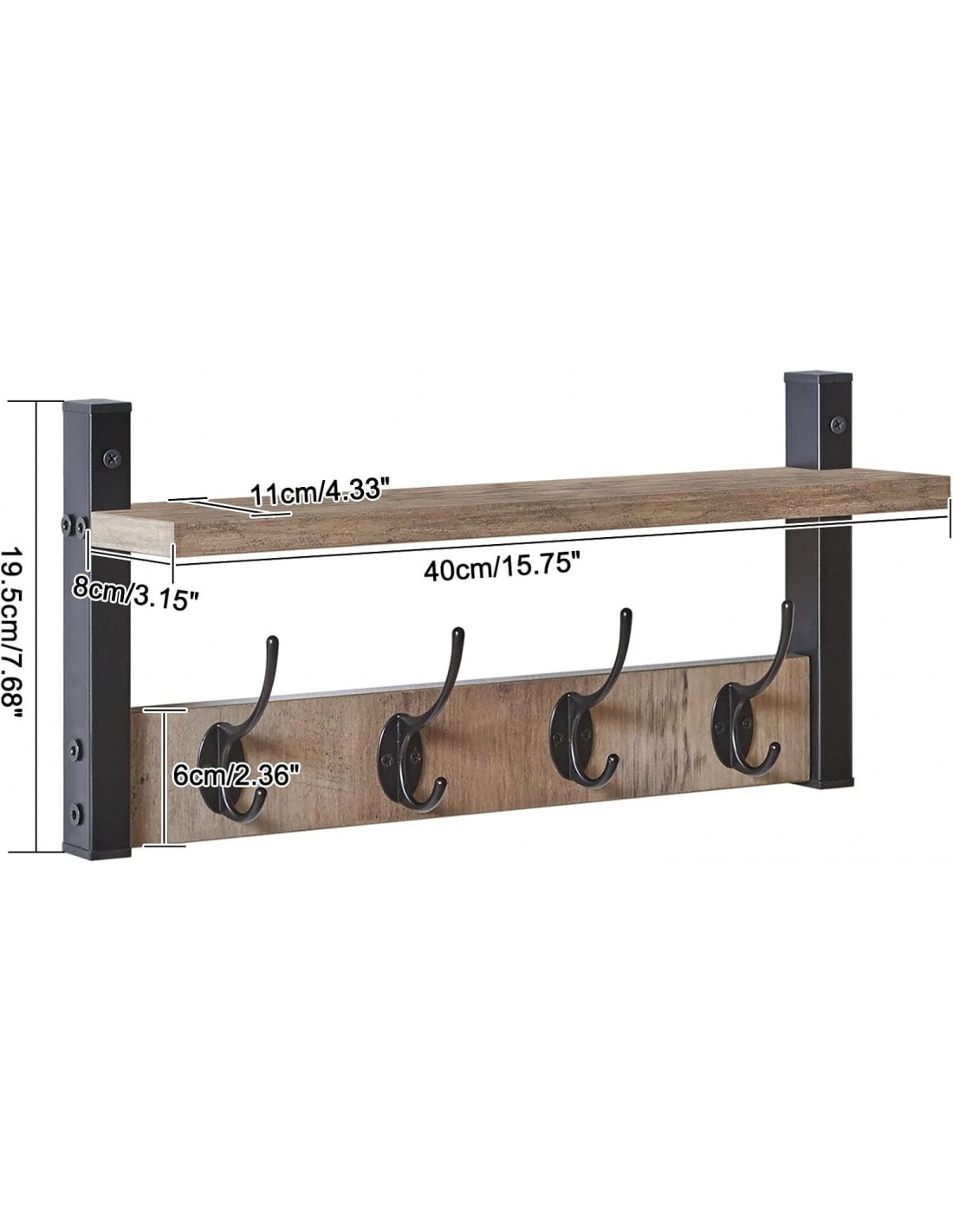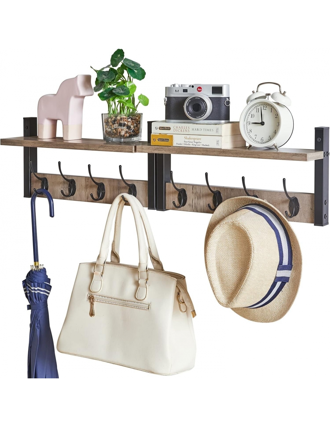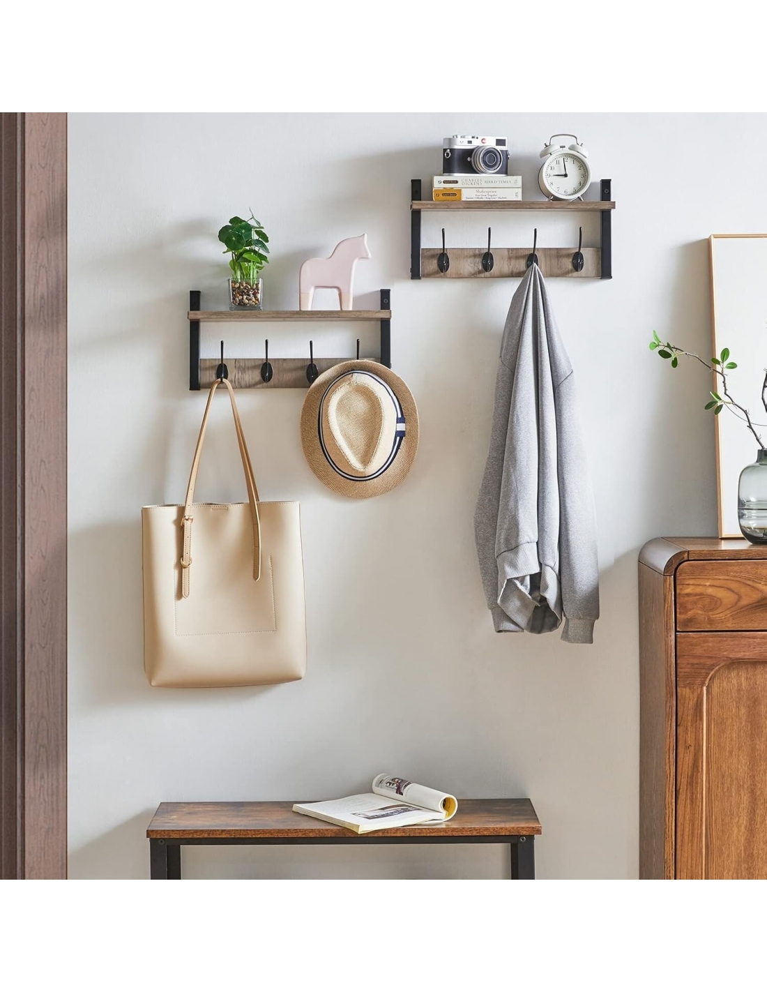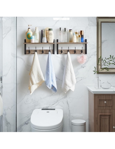 Appendiabiti a Parete, Mensole con 8 Ganci, Muro Scaffale, per Ingresso, Bagno