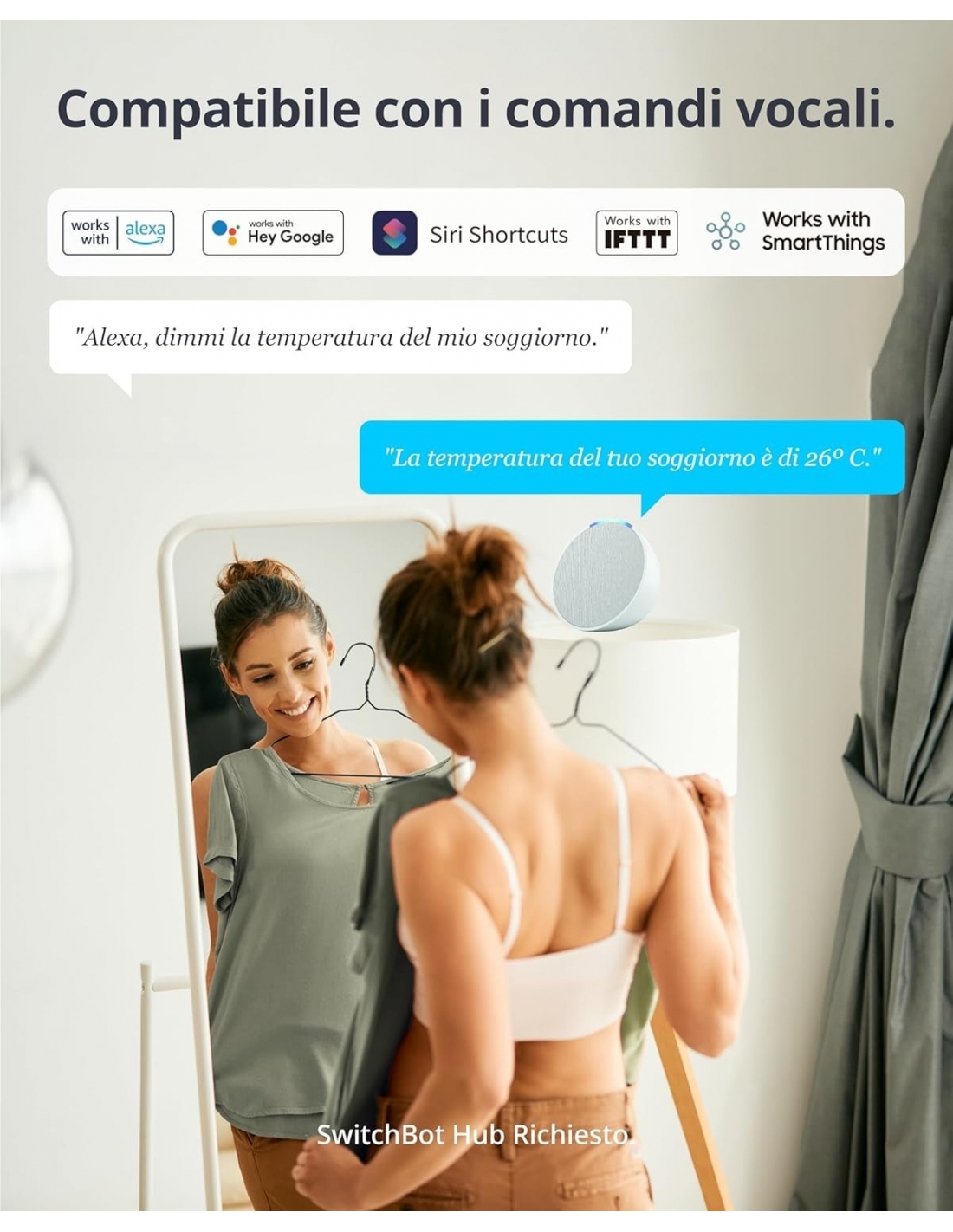 - Si integra nell’ecosistema SwitchBot: collega il sensore di contatto con altri prodotti SwitchBot e imposta “Scene" nell’app di SwitchBot (lingua italiana non garantita). Quando torni a casa, SwitchBot Bot (che preme un pulsante) verrà attivato automaticamente per accendere la luce e Alexa ti dirà «benvenuto a casa». Quando esci di casa, la telecamera interna SwitchBot si accende automaticamente per rilevare le condizioni interne (SwitchBot Hub necessario).