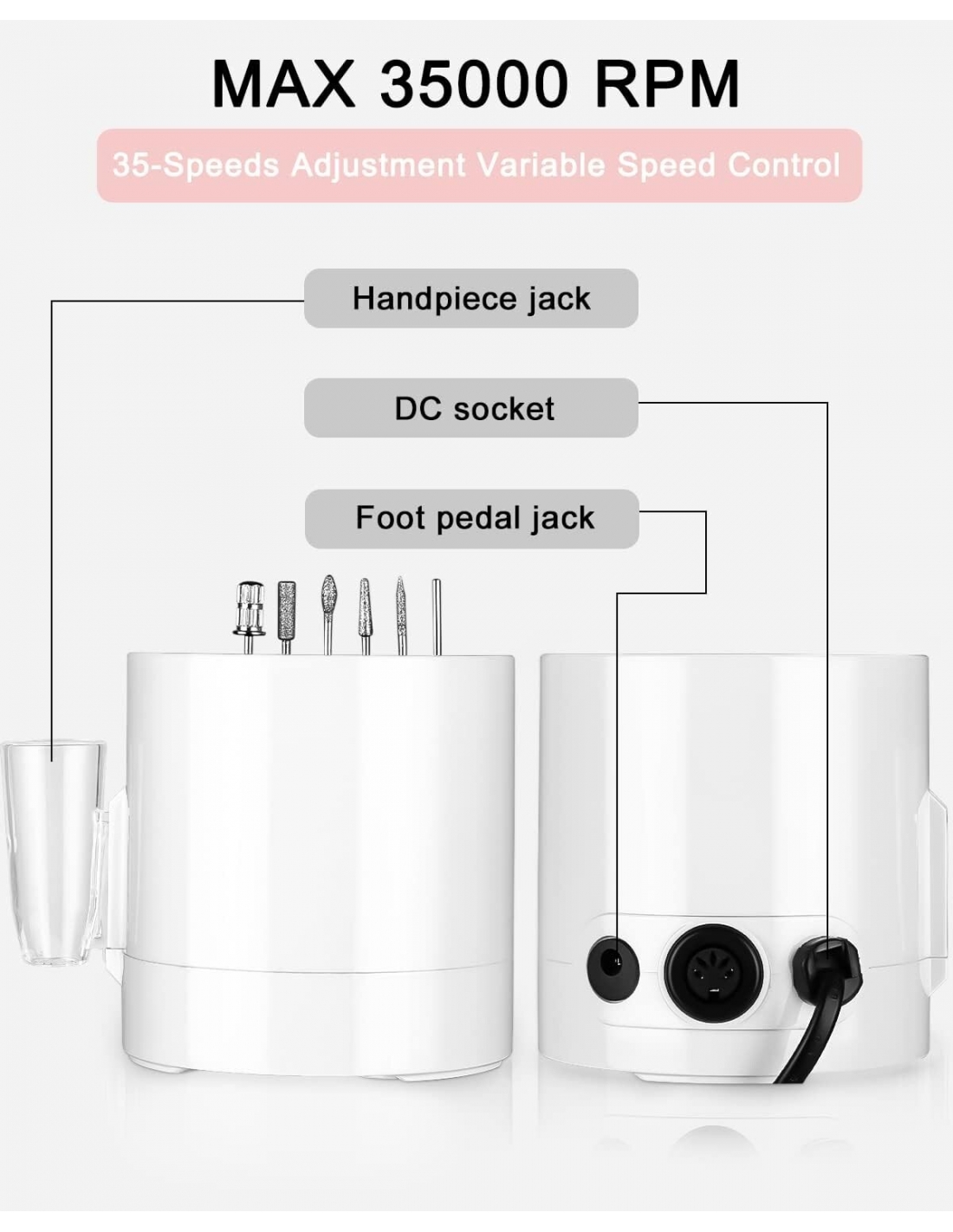 - Il display LCD della Fresa per Unghie mostra la velocità e la direzione e dispone di 35 impostazioni di velocità, in modo che anche i principianti possano impostare la velocità con precisione senza preoccupazioni. Con una gamma di velocità compresa tra 0 e 35.000 giri al minuto, è adatto alla lucidatura di tutti i tipi di smalto. I pulsanti sensibili al tatto sono esteticamente più gradevoli e comodi. Durata maggiore rispetto ai pulsanti tradizionali.