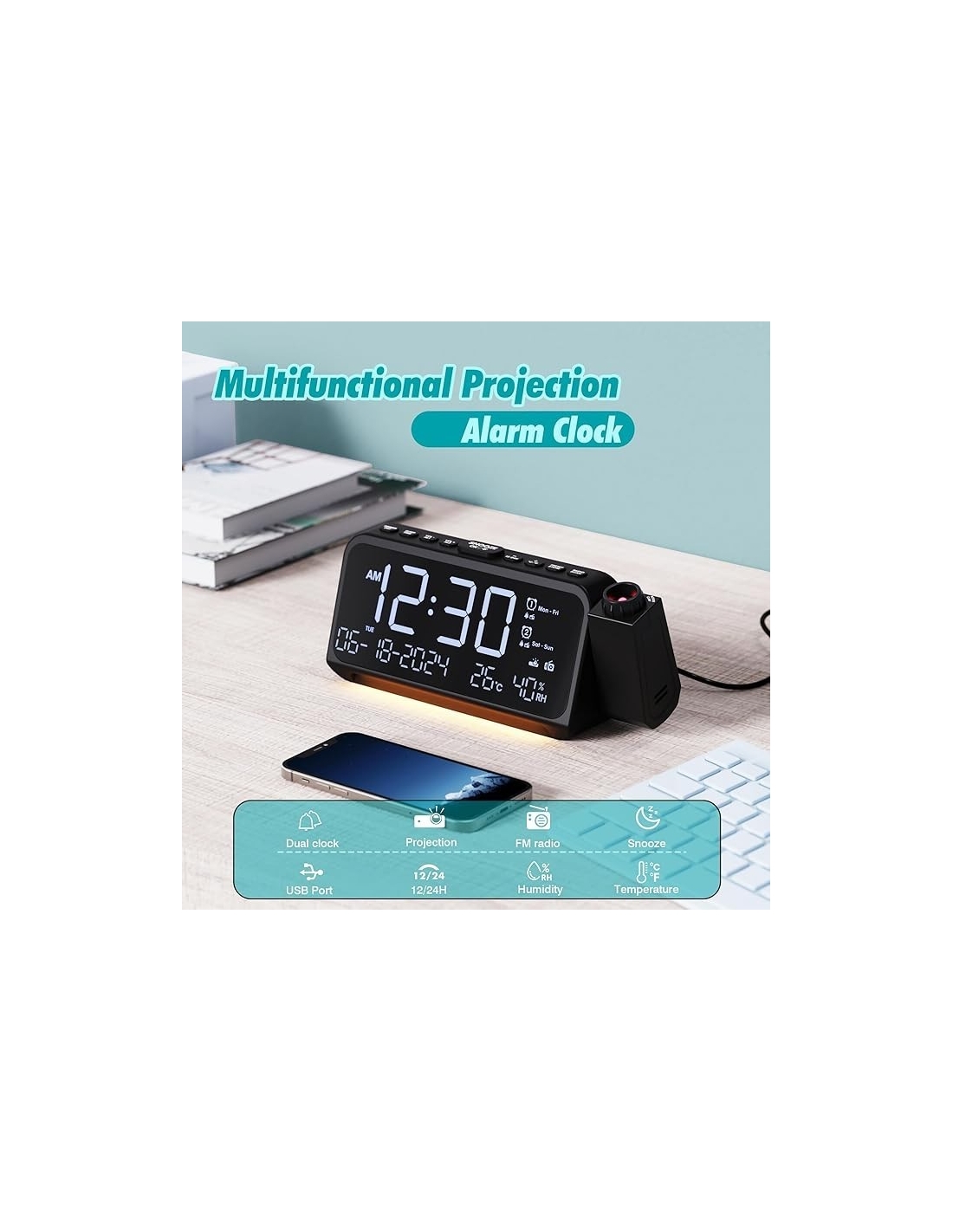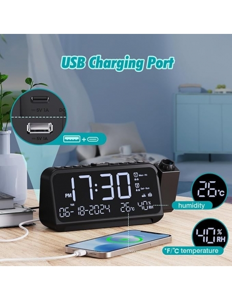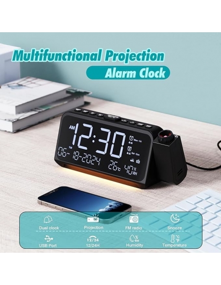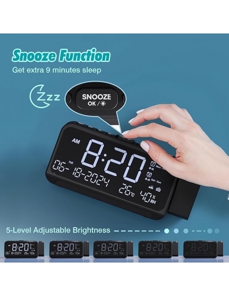 - 【Ampio display con informazioni meteo e data】: dotata di monitoraggio dell'umidità e termometro, questa sveglia digitale con proiezione ti tiene informato sulle fluttuazioni della temperatura e dell'umidità interna. Passa facilmente tra le letture Celsius e Fahrenheit in base alle tue preferenze. L'ampio display mostra l'ora, il calendario e la data, consentendo a questa radiosveglia multifunzionale di integrarsi nella vita quotidiana della tua famiglia.
