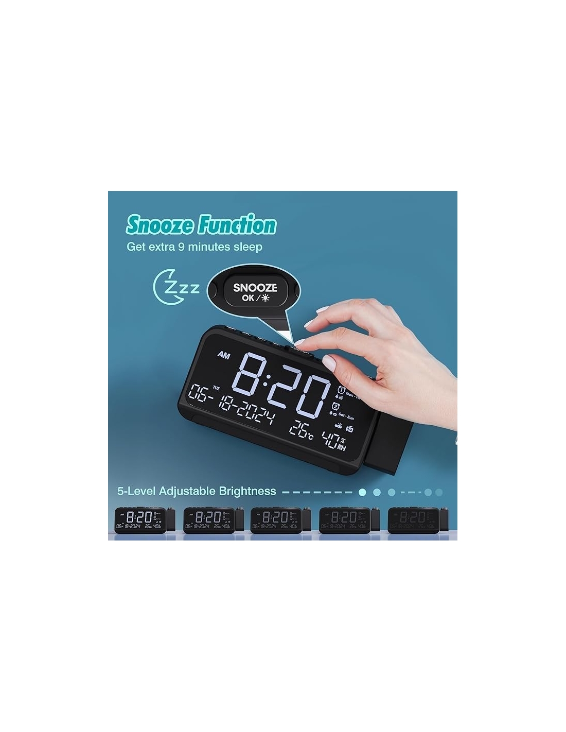 - 【Doppia sveglia con modalità versatili per i tuoi impegni】Questa elegante sveglia da comodino è dotata di due allarmi distinti, ognuno configurabile per adattarsi alle tue diverse esigenze di stile di vita con quattro modalità: giornaliera (dal lunedì alla domenica), nei giorni feriali (dal lunedì al venerdì), nei fine settimana (dal sabato alla domenica) o un'impostazione una tantum per adattarsi alle tue diverse occasioni. Quando questa sveglia a LED suona, basta toccare il pulsante snooze in alto per silenziare momentaneamente la sveglia ad alto volume e suonerà di nuovo dopo 9 minuti, evitandoti di dormire troppo.