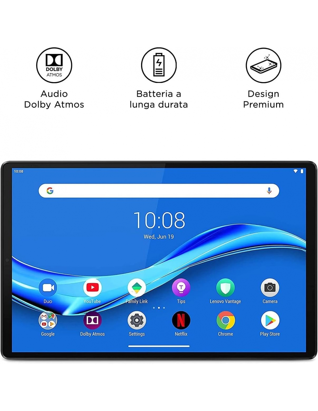 - Lenovo Tab M10 FHD Plus (2a Gen) ha uno chassis interamente in metallo ed è liscio, mentre il rapporto superficie/display è quasi del 90%; design elevato che tutti in famiglia vorranno utilizzare