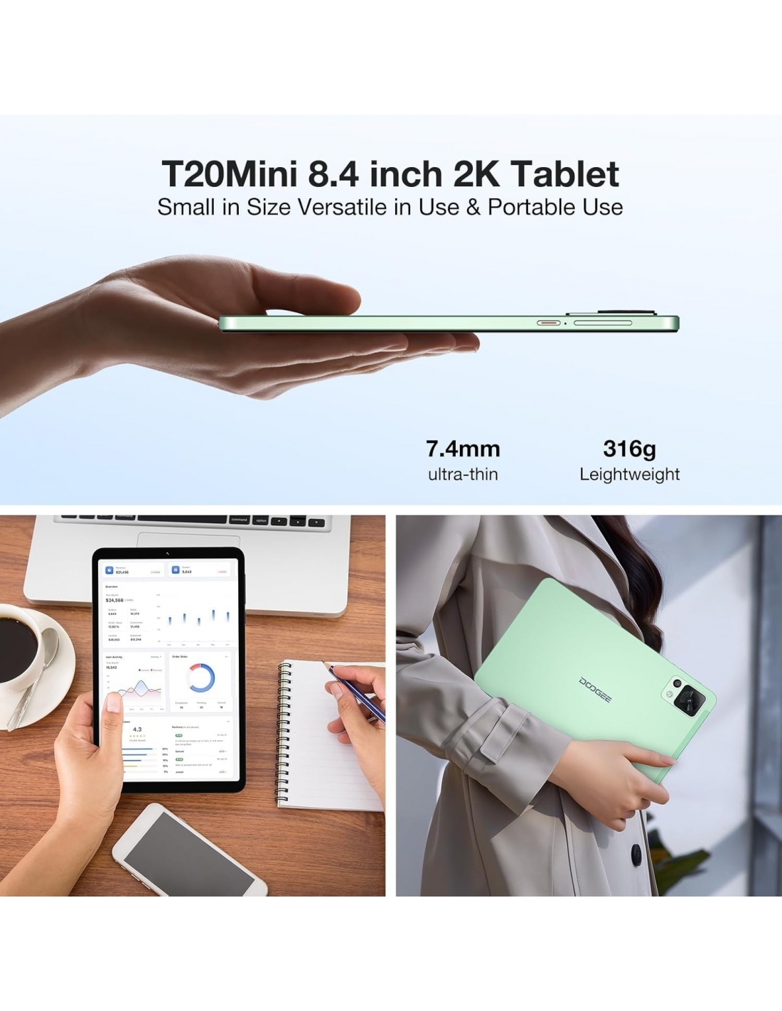 - DOOGEE T20 Mini Tablet andriod 13 è dotato di un display IPS FHD+ da 8,4 pollici (risoluzione: 1920 x 1200) che visualizza le immagini con una perfetta saturazione e vivacità dei colori. Questo T20 Mini Tablet 8 pollici è certificato TÜV e compatibile con Widevine L1. Tablet in offerta design sottile da 7,4 mm rende questo mini tablet perfetto da portare ovunque-- Tablet con sim