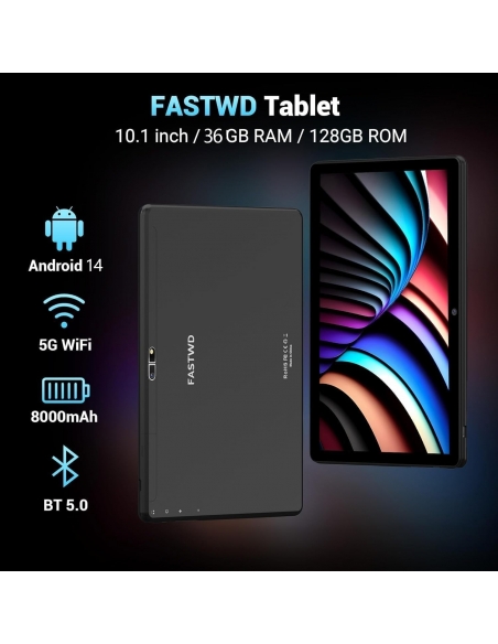 FASTWD 2025 Newest Tablet 10 Pollici Android 14,Tablet PC 5G WiFi 36GB RAM+128GB ROM (1TB TF),Batteria 8000mAh,Tablet 2 in 1 con tastiera,penna,mouse,Nero