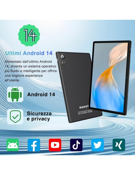 - 【Android 14 + Certificato GMS】S10 è un tablet sviluppato dal marchio SUAAT con l'ultimo Android 14. Il sistema del tablet è ulteriormente migliorato per consentire la piena sicurezza della privacy. Il tablet S10 è certificato GMS e viene fornito con Play Store preinstallato per scaricare facilmente tutte le app preferite. Il tablet S10 è ricco di contenuti, con temi personalizzabili e la possibilità di cambiare le icone delle app a piacimento. Il tablet offre anche nuove funzionalità come multiutente, multifinestra, split-screen e controlli parentali.