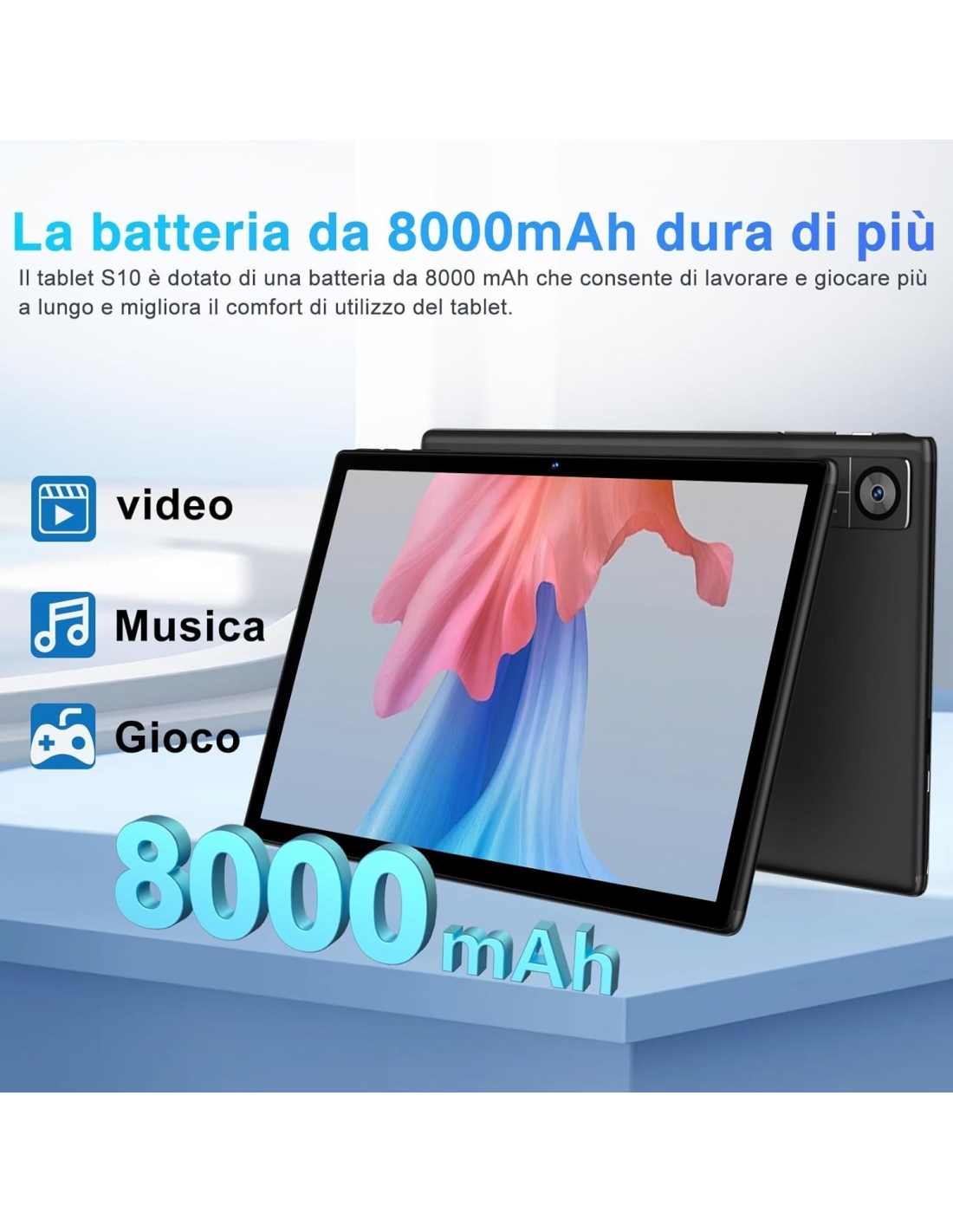 - 【10.1 Pollici+Certificato WideVine L1】Il Tablet S10 ha uno schermo IPS da 10.1 pollici con una risoluzione di 1280*800, che offre una migliore chiarezza dello schermo e colori ricchi.Il Tablet S10 supporta WideVine L1, che permette di sentire Youtube o Netflix su riproduzione video chiara a 1280P.Nel frattempo, il tablet S10 è abilitato al GPS e lo schermo HD facilita la visualizzazione del percorso.
