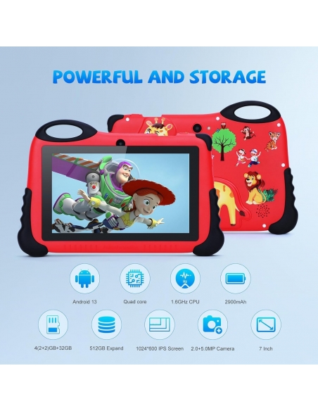 - 【Potente tablet per bambini】Il tablet da 7 pollici per bambini è dotato dell'ultimo sistema Android 13. Offre al tablet per bambini prestazioni migliori rispetto ad Android 12, con un funzionamento più fluido e un consumo energetico inferiore. Esegui tutti i tipi di app, giochi e video per il tuo bambino.