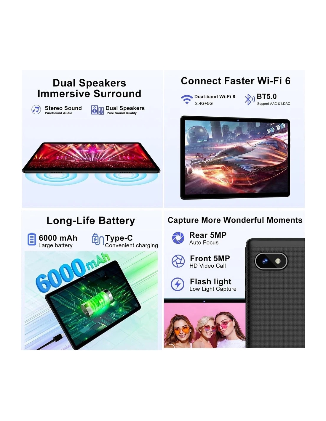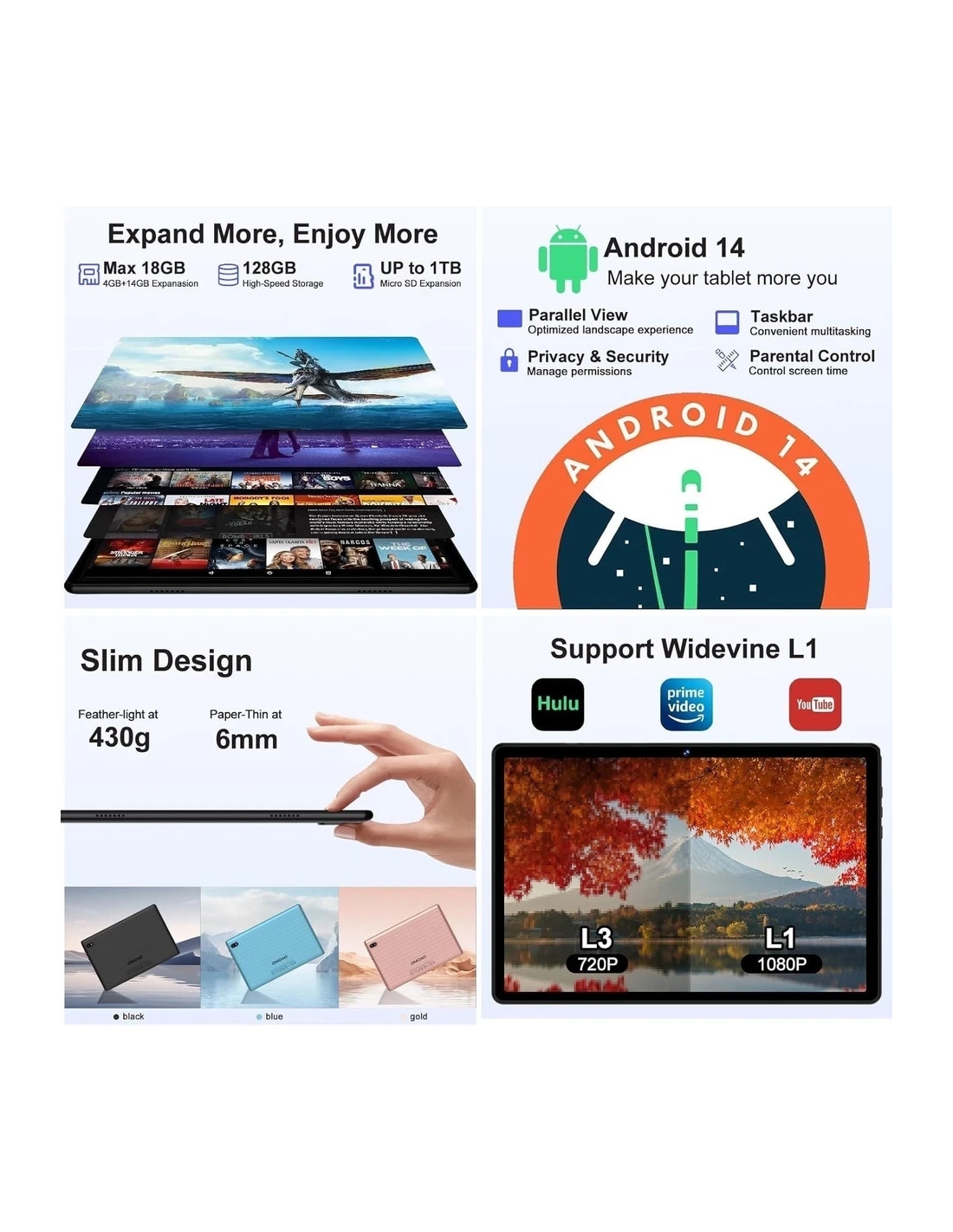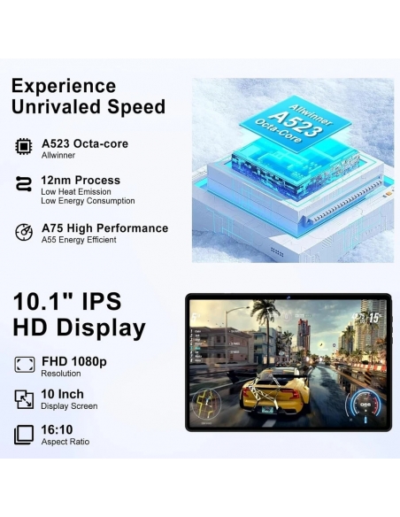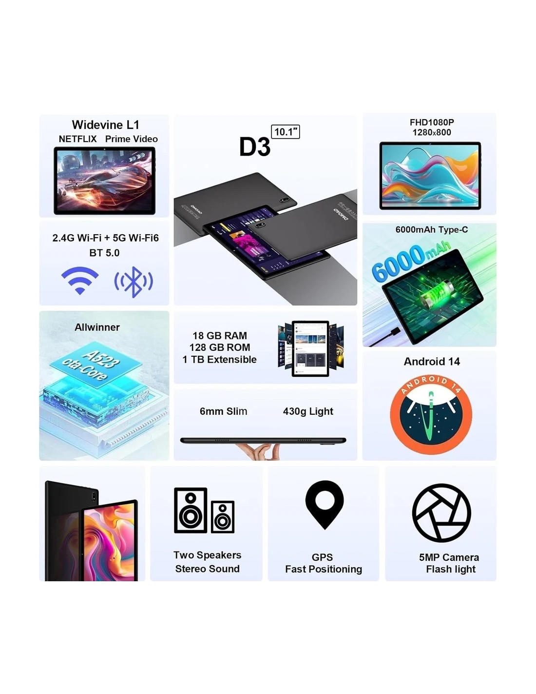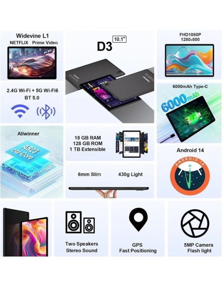 DMOAO D3 Tablet 10 Pollici Android 14 con 5G WiFi 6, 18 GB RAM + 128 GB ROM (TF 1 TB)