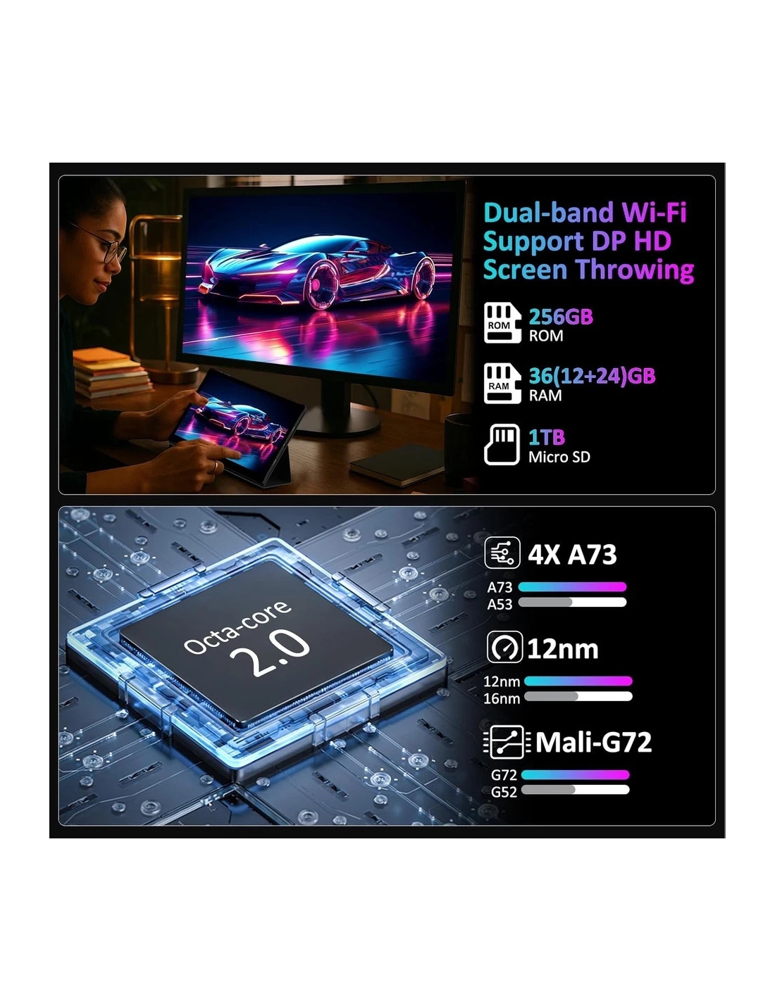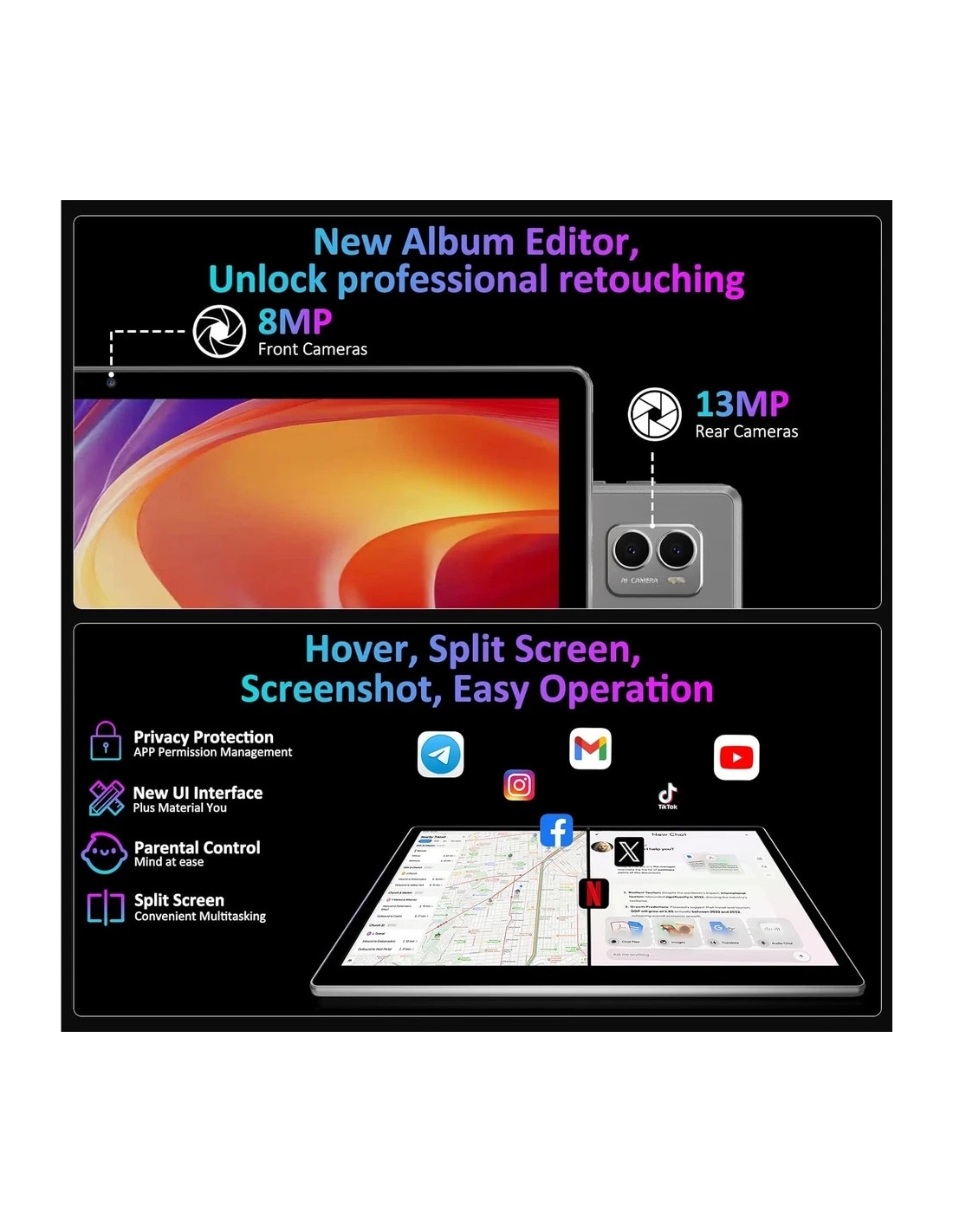 • 💾13MP+AI Camera+36(12+24)GB RAM+256 GB ROM💾Tablet offerta con design a doppia fotocamera,8MP+13MP+Macro 2MP camera,editor di nuovi album incorporato e funzione di ritocco professionale, le immagini sono chiare e dettagliate, adatte a scattare foto di alta qualità. gb Extended RAM) e 256GB ROM, supportando 1TB di spazio di archiviazione aggiuntivo (si prega di notare che la scheda Micro SD/TF deve essere acquistata da voi stessi), fornendo un sacco di spazio per l'esecuzione di più app, lavorare a lungo e giocare.