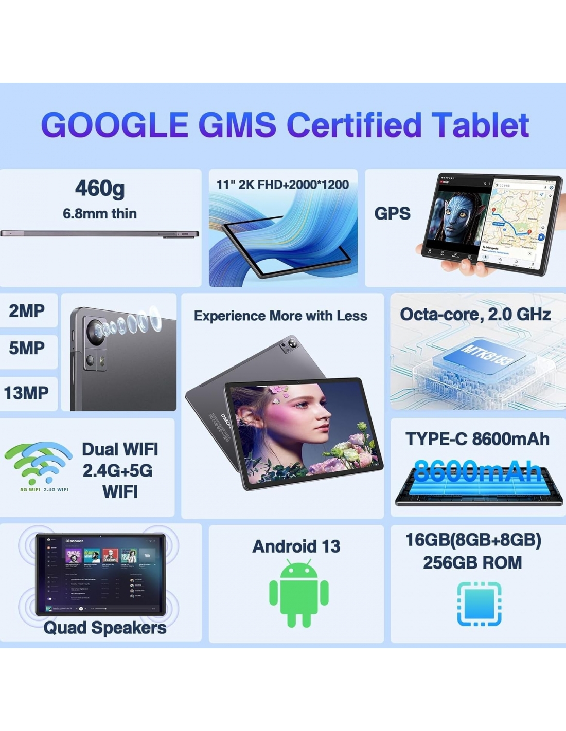 DMOAO D11 Tablet 11 Pollici Android 13 con 16 GB RAM 256 GB ROM (1 TB espandibile), 2 K FHD Tablet con tripla fotocamera (13 MP+5 MP+2 MP), 8 Cores, 2.0 GHz, IPS 2000 * 1200, 5 G Wi-Fi, Batteria 8600 mAh, Grigio