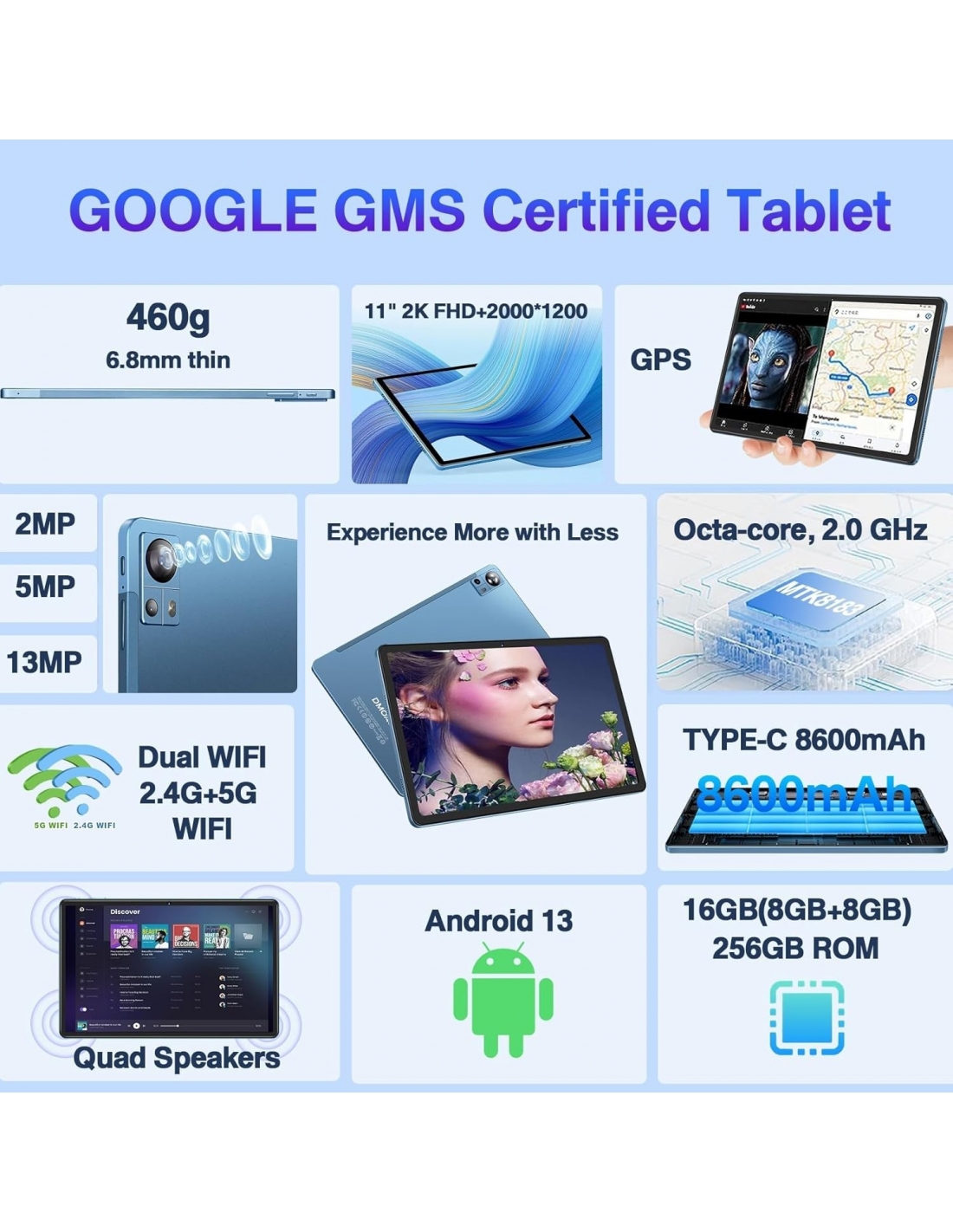 DMOAO D11 Tablet 11 Pollici Android 13 con 16 GB RAM 256 GB ROM (1 TB espandibile), 2 K FHD Tablet con tripla fotocamera (13 MP+5 MP+2 MP), 8 Cores, 2.0 GHz, IPS 2000 * 1200, 5 G Wi-Fi, Batteria 8600 mAh, Grigio