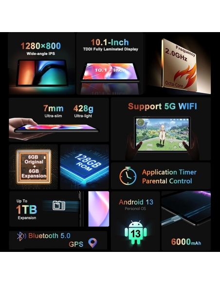 - 🚀【𝐓𝐚𝐛𝐥𝐞𝐭 𝐜𝐨𝐧 𝟓𝐆 𝐖𝐢-𝐅𝐢】Questo tablet android 13 supporta il WiFi ad alta velocità a 5,0Ghz e 2,4Ghz dual-band.Garantisce alla connessione WiFi del tablet una velocità di internet elevata e un buon segnale attraverso i muri.Supporta la trasmissione wireless Bluetooth 5.0.Mantenete il vostro tablet stabile e veloce per i trasferimenti di file e audio.Il T13 utilizza una porta di ricarica USB-C e supporta il funzionamento a schermo diviso e il GPS.