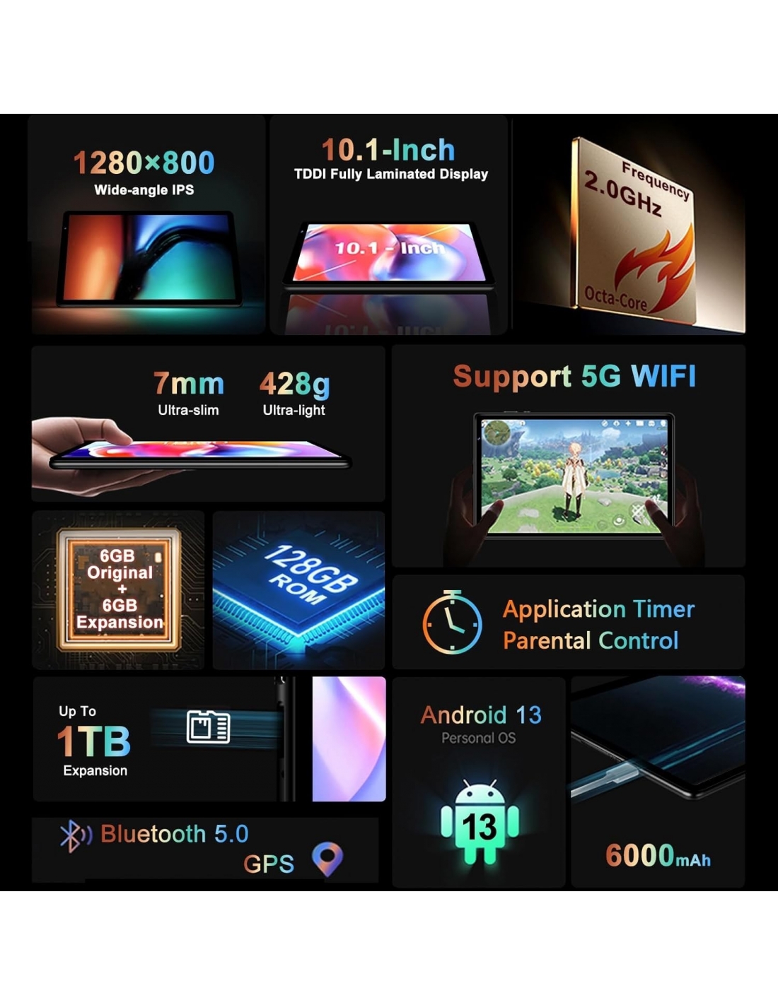 YESTEL T13 Tablet 10 Pollici Android 13 Con 12GB RAM 128GB ROM (TF 1TB), CPU 2.0 GHz, 5MP+8MP, HD 2 in 1 Con 5G Wi-Fi, Octa-Core, Bluetooth 5.0, GPS,