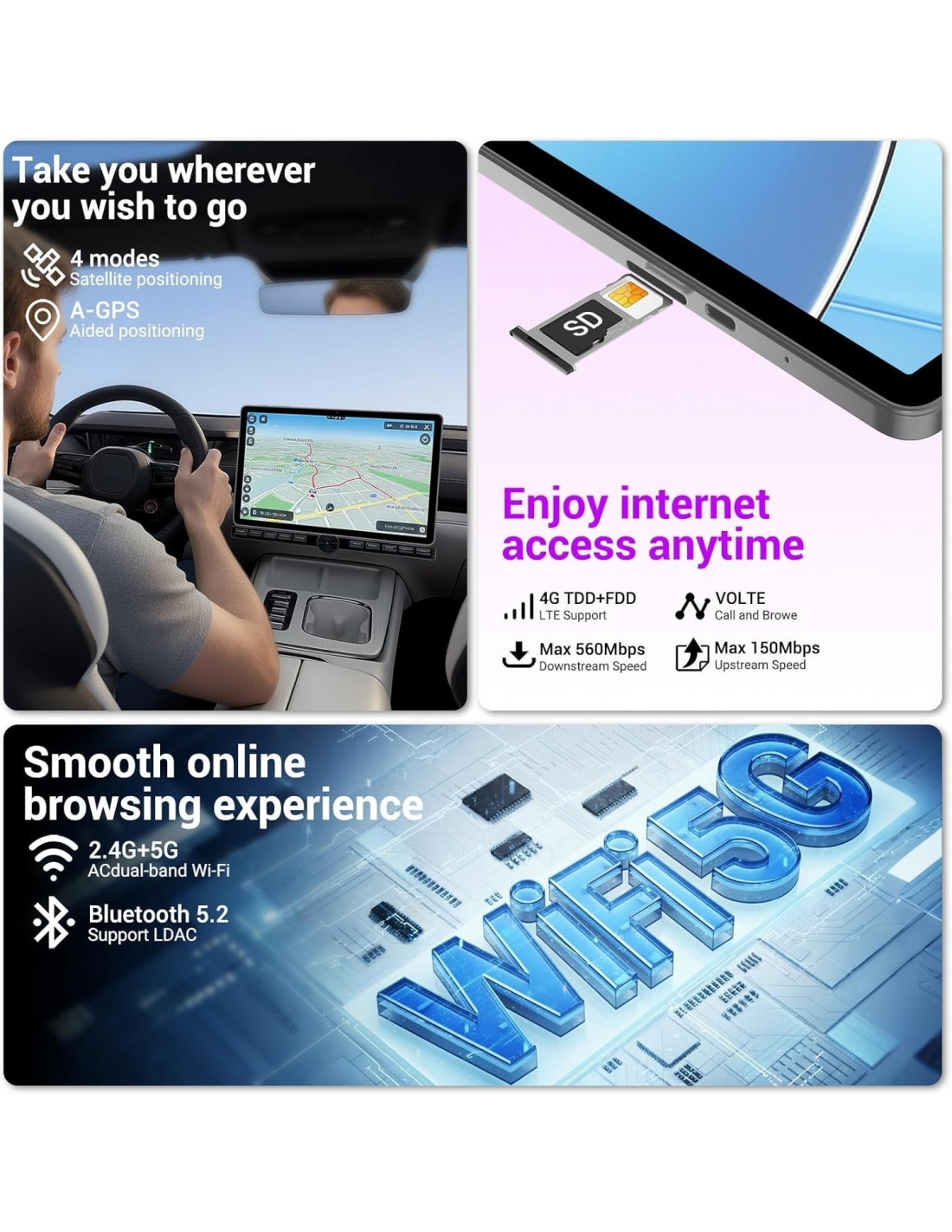 - 📞 5G WIFI&4G LTE&8000mAh Batteria 🔋 Tablet 4G LTE sono dotati di uno slot per schede SIM, che supporta reti 2G/3G/4G e WiFi a doppia banda 5G, garantendo un'esperienza di navigazione fluida e senza problemi. La batteria ultra-grande capacità di 8000 mAh, combinata con la gestione intelligente dell'energia AI e la modalità risparmio energetico, può rilevare e filtrare automaticamente l'APP di consumo di energia di fondo, mantenendo il tablet in uno stato sano, estendendo la durata della batteria.