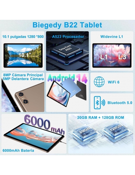 Biegedy B22 Tablet Android 14 Octa-Core 10 Pollici, 20GB RAM+128GB ROM (1TB TF), 5G/2.4G WiFi 6, Widevine L1/6000mAh/GMS/Bluetooth 5.0/5+8MP ORO