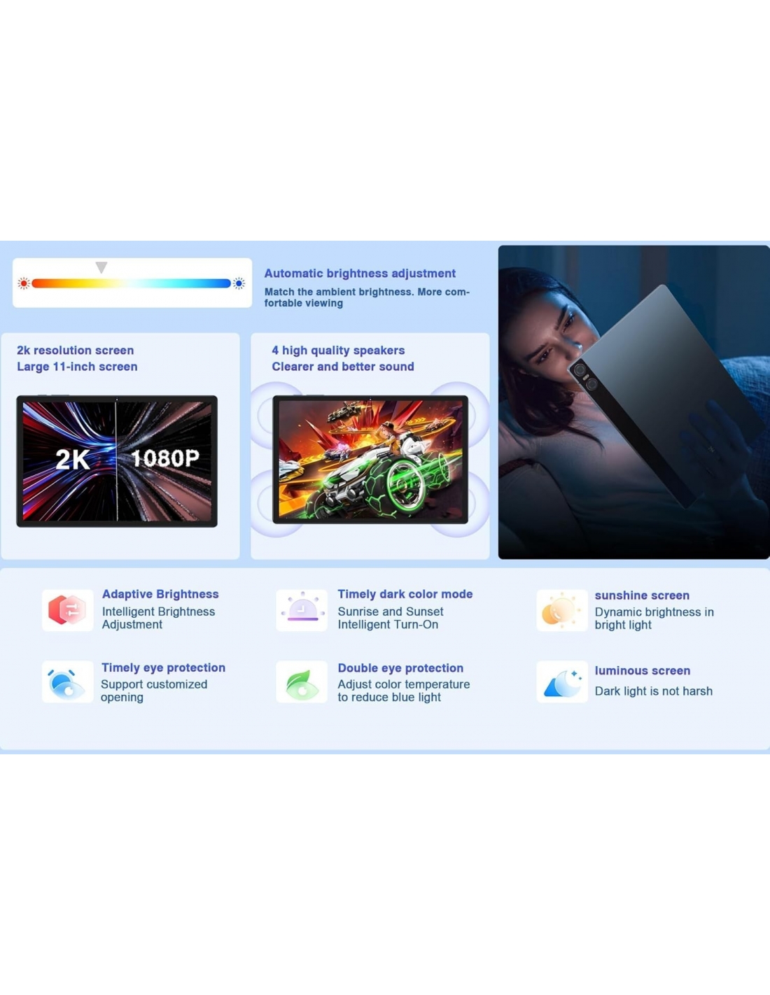 - Il tablet 11 pollici T15 è dotato di uno schermo IPS Full HD 2000×1200, perfetto per guardare video, leggere o lavorare. I 4 altoparlanti stereo offrono un audio chiaro e potente, rendendo ogni contenuto un piacere da ascoltare.