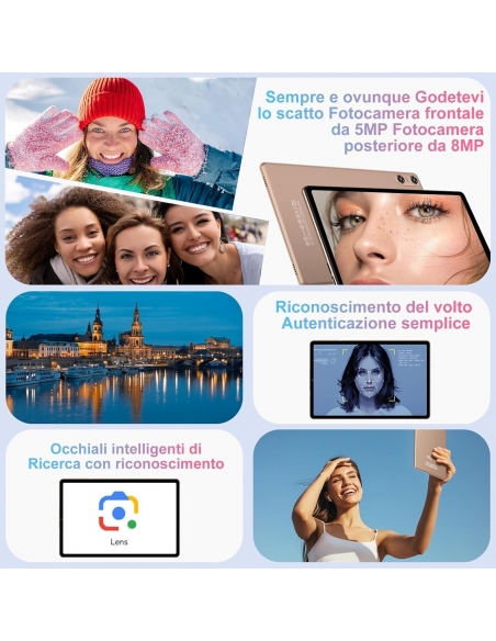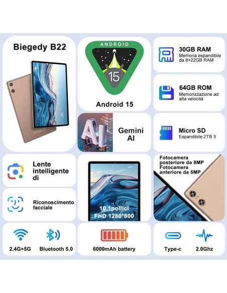 Biegedy B22 Tablet Android 10.1" RAM 30 GB(8GB+22GB) + ROM 64 GB (TF 512 GB) Octa-Core Widevine L1 Dual Band WiFi 6 6000 mAh 5 MP + 8 MP 1280 x 800 Pixel GMS Bluetooth 5.0 con tastiera e mouse ORO