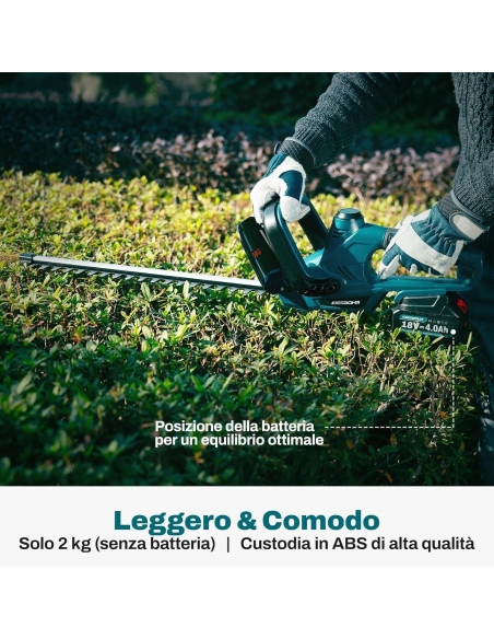 - Sicurezza prima: il tagliasiepi leggero è dotato di un coperchio per lama, protezione contro gli urti della lama, parafango paraspruzzi e doppio interruttore di sicurezza per garantire un lavoro sicuro.