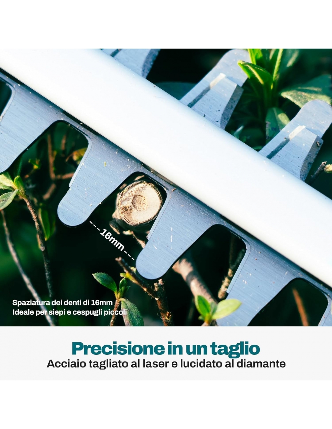 - Lame di alta qualità: le lame di questo tagliasiepi a batteria sono realizzate in acciaio tagliato al laser e diamantato, che garantisce affilatura e durata. Il design a doppia foglia con distanza tra i denti di 16 mm consente un taglio efficiente di piccole siepi e arbusti.