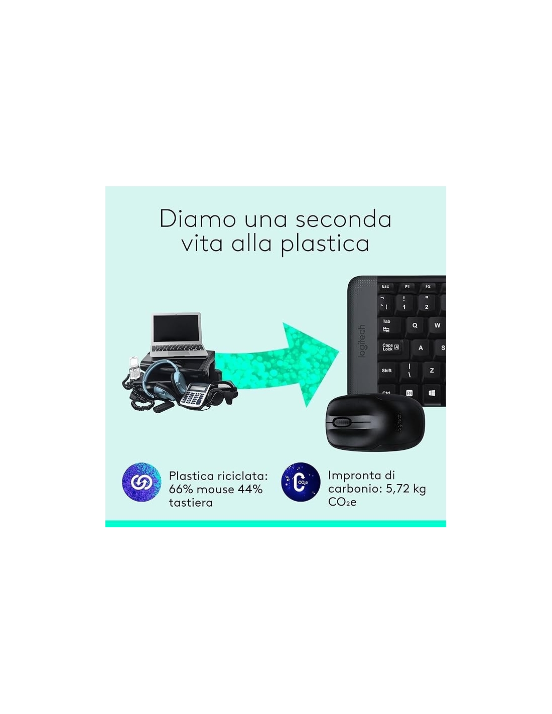 - Le parti in plastica di MK220 includono plastica riciclata post-consumo certificata: 66% per il mouse, 44% per la tastiera e 75% per il ricevitore*